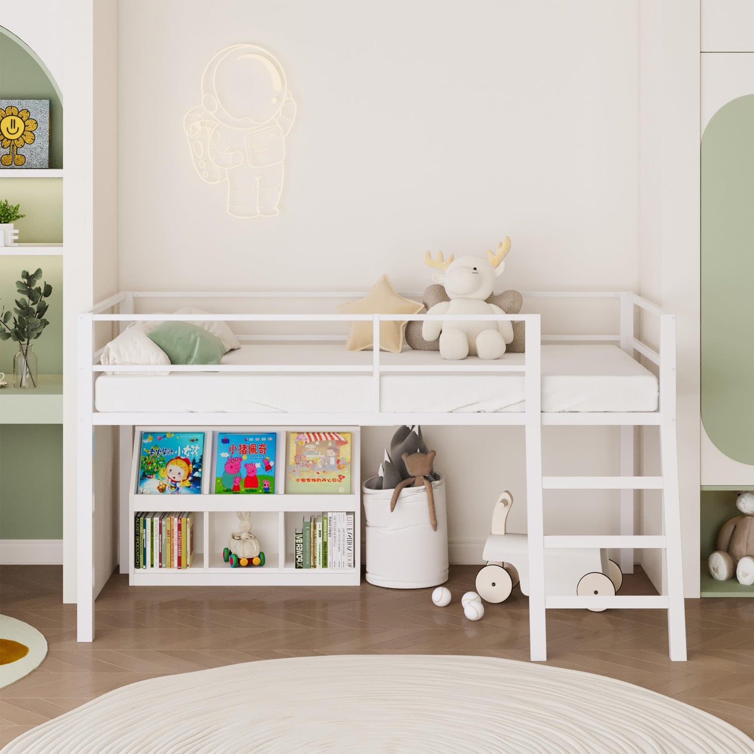 - Stair with Ramp: The ladder of this low loft bed is design in ramp structure and will easy for your kids to climb into and out of bed.