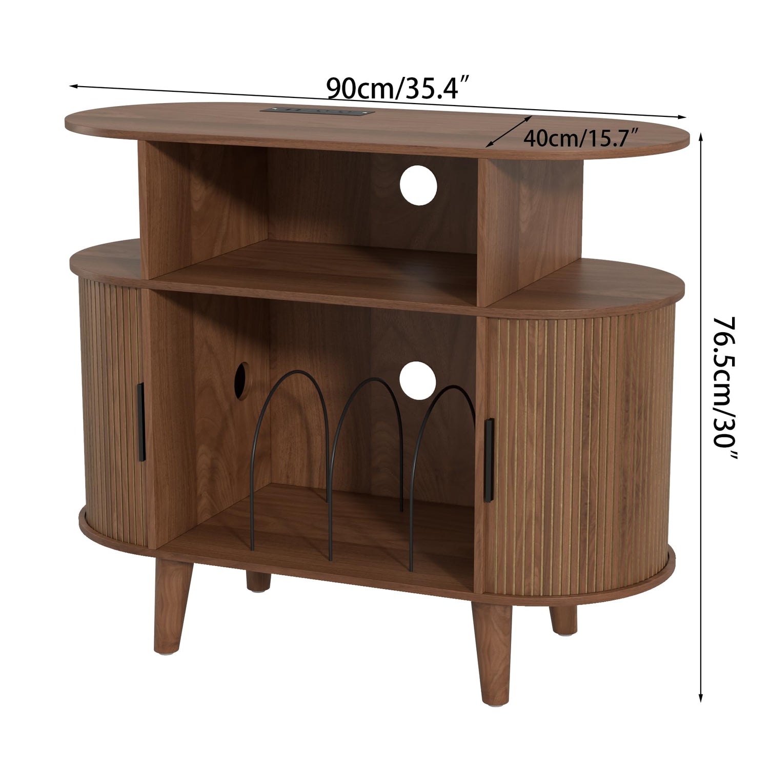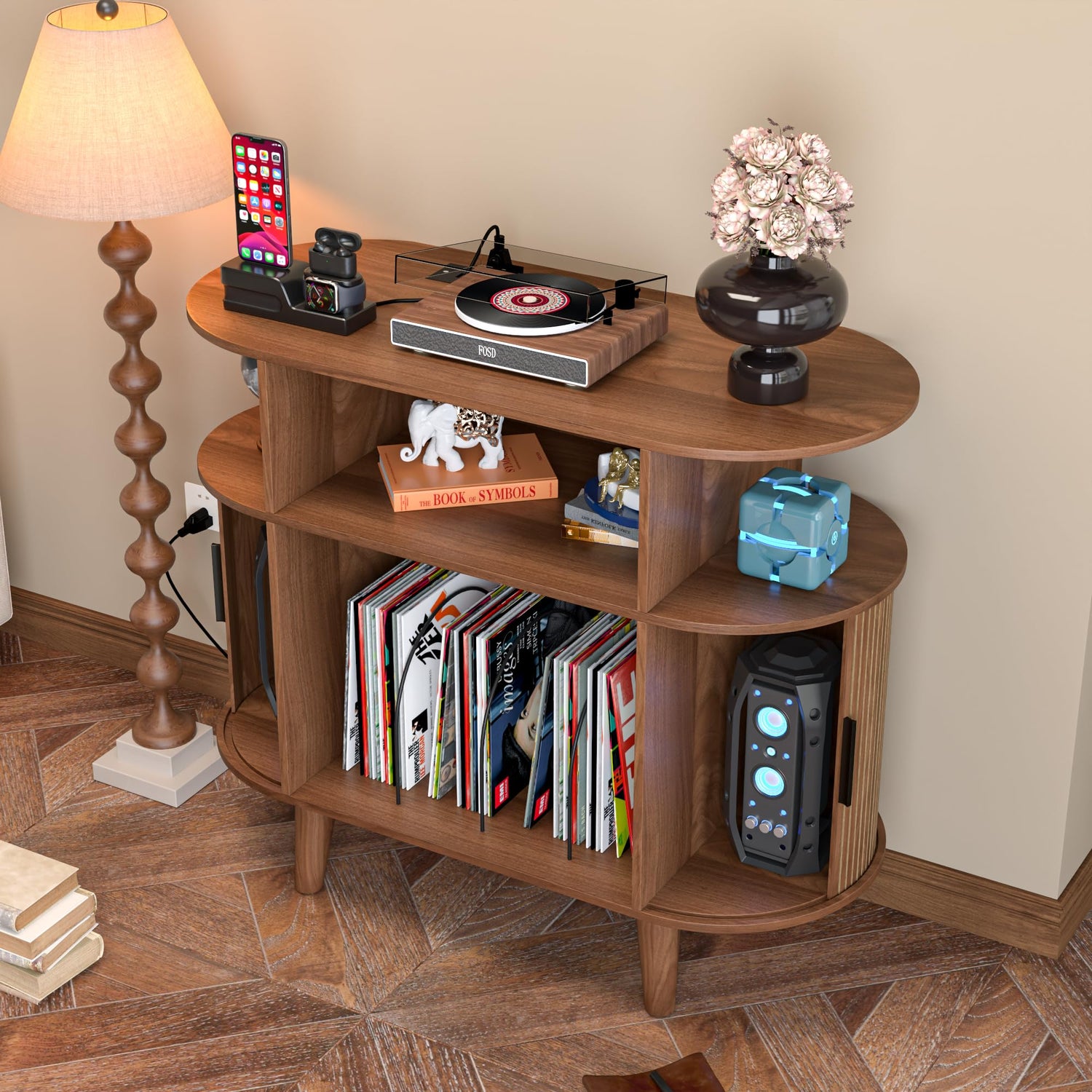 LUVIOHOME Large Round Record Player Stand with Charging Station & USB Ports,Record Storage Cabinet, Mid Century Modern Turntable Stand for Bedroom Living Room (Small Brown)