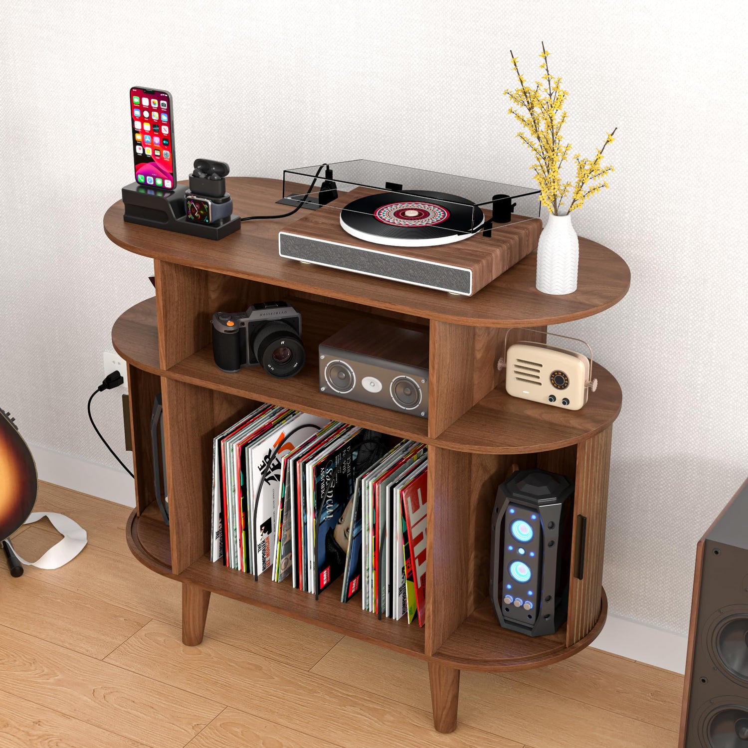 LUVIOHOME Round Record Player Stand, Mid-Century Record Player Table, Vinyl Record Player Shelf with Power Outlet Sideboard Buffet Cabinet, Storage Shelf for Living Room (Brown)