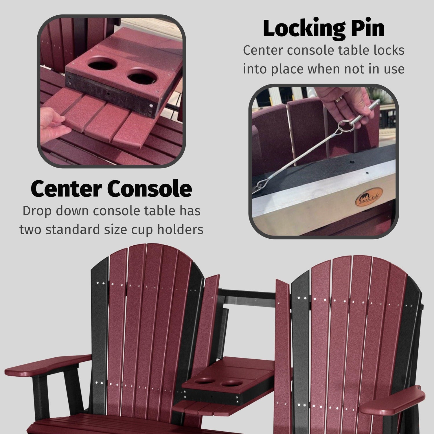 Details: Enjoy what Mother Nature has to offer with this simple, yet elegant love seat yard glider patio bench. The contoured seat and rounded edges of the patio glider bench provide premium comfort. Seats up to three people, but two comfortably with center console table down. The center console of the porch glider bench can be locked in upwards position with locking pin when not in use. This gliding patio loveseat slides back and forth to melt the days stress away. --- Dimensions - Overall: 67"W x 30"D x 43"H, Seat: 60"W x 18"D, Weight: 140 lbs. Assembly is required for the patio bench glider, however, thorough instructions are included for easy assembly. --- This heavy duty glider rocker is made from poly lumber (HDPE) a plastic made from post-consumer recycled waste like milk jugs and laundry bottles. The plastic is melted and pressed into dense boards that can be used as a building material, such as outdoor furniture. Our poly is 90% recycled plastic by weight, so you can feel good about your LuxCraft gliding patio furniture. Poly is also exceptionally resistant to splintering, warping, moisture and many other environmental factors. Built with UV stabilized pigments to minimize fading through sun and weather exposure. --- LuxCraft products are backed by a limited lifetime residential warranty, and a 5-year limited commercial warranty. Defective and non-conforming products or parts are replaced at no cost to you. Contact our sellers for more information.