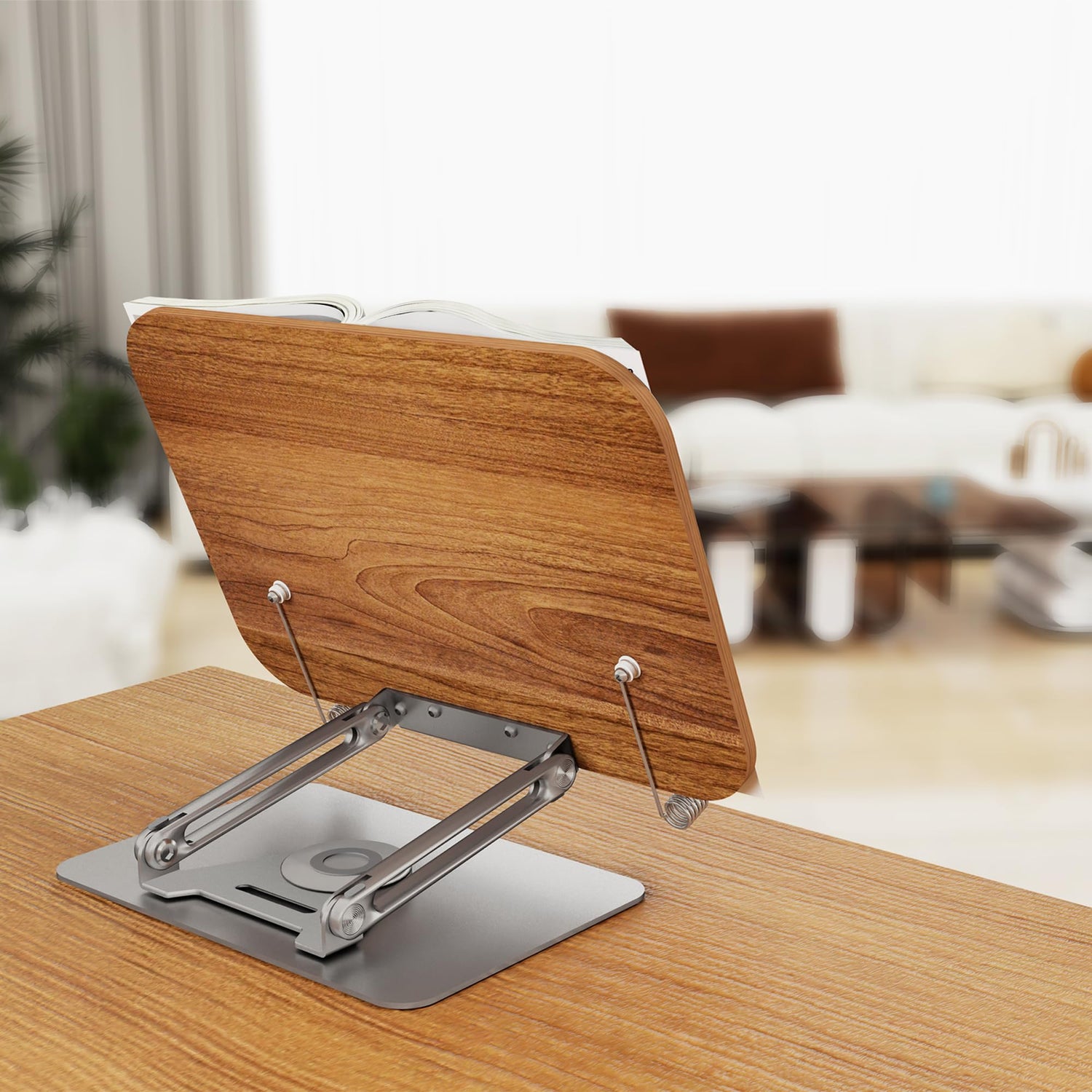 - Premium Materials: This book display stand is constructed from robust wood and aluminum, non-wobble design and making it an excellent display stand with a modern look, it also functions as a rotating display stand and a paper holder for typing. To ensures a solid foundation, we added anti slip pads on the base to increase stability. Designed with convenience in mind, the book holder is foldable, facilitating easy portability.
