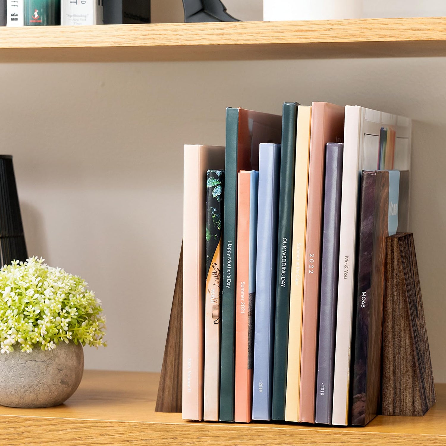 - [Heavy&Sturdy Walnut Wood Bookends]: Wooden book ends has a triangular design with thicker and stable bottom + metal base,which makes it stable to store heavy books or binders, perfect for office desk. Fine craft wood book ends can blends with your bookshelves. Heavy duty walnut bookends for heavy books