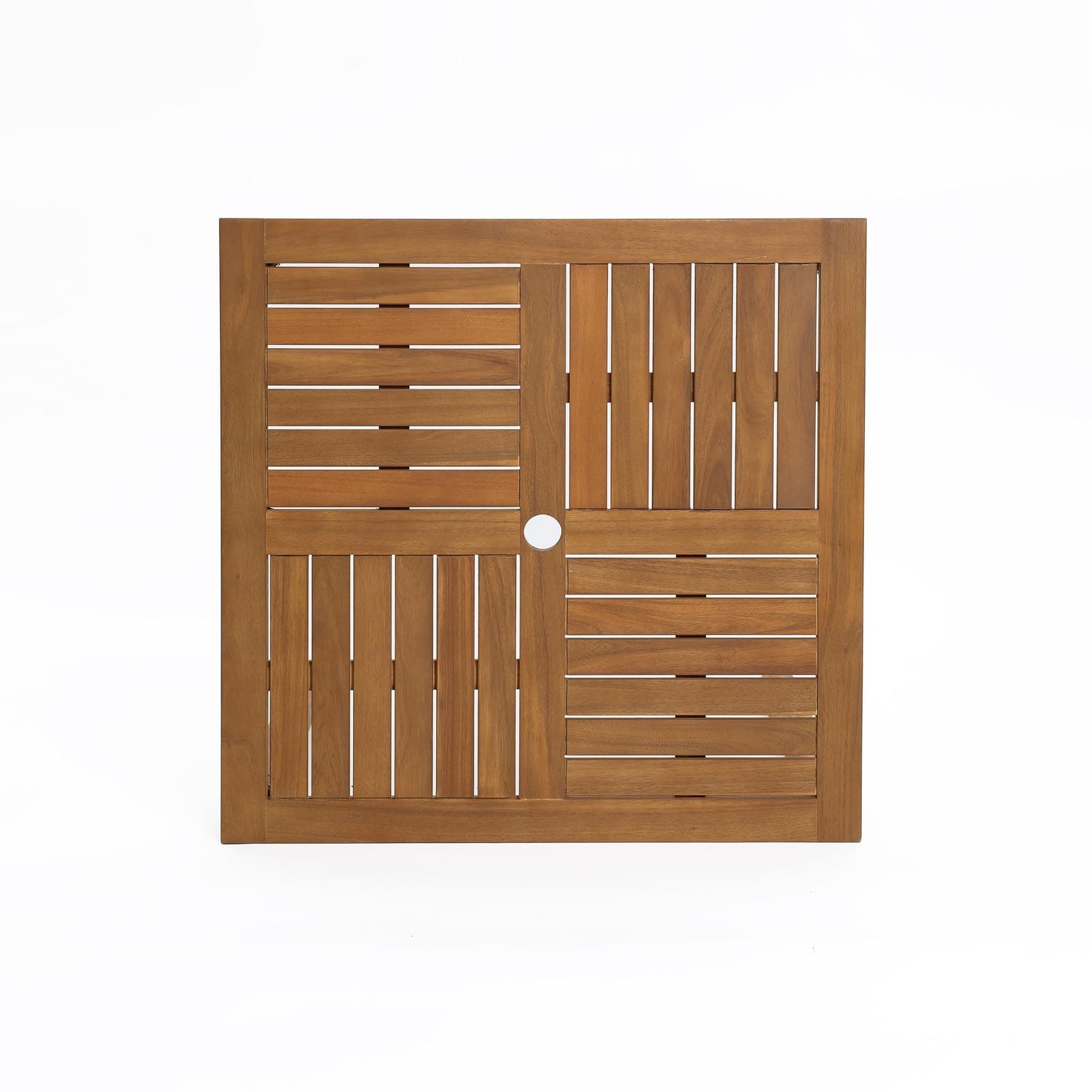 Details: The Outdoor Acacia Wood 37-Inch Counter Height 4-Person Dining Table is a perfect blend of sturdy construction and stylish design for your outdoor furniture needs. Made from acacia wood, it ensures durability, ideal for any outdoor dining set. The oil-based finish protects against elements, ensuring longevity. This outdoor patio table, with its 33.4 inches square top and 37.8 inches height, is perfect for intimate gatherings, offering ample space for four. Its central umbrella hole design is practical for an outdoor bar table or pub table setup, enhancing comfort with a sun umbrella. The lattice design on the tabletop is both aesthetic and functional, preventing water accumulation and quick drying, crucial for outdoor use. This design fits well in various outdoor settings, from balcony to porch, complementing any outdoor patio furniture. Its counter height provides an elevated dining experience, similar to what you might find in a restaurant or bar, making it suitable for both casual and formal outdoor dining scenarios. The outdoor table's solid wood construction is easy to maintain, offering durability and resistance to weather elements, a reliable choice for areas with varying weather conditions. This outdoor dining table is not just furniture; it's a statement piece that enhances the usability and aesthetic appeal of your outdoor space, perfect for creating a comfortable and inviting outdoor dining area.