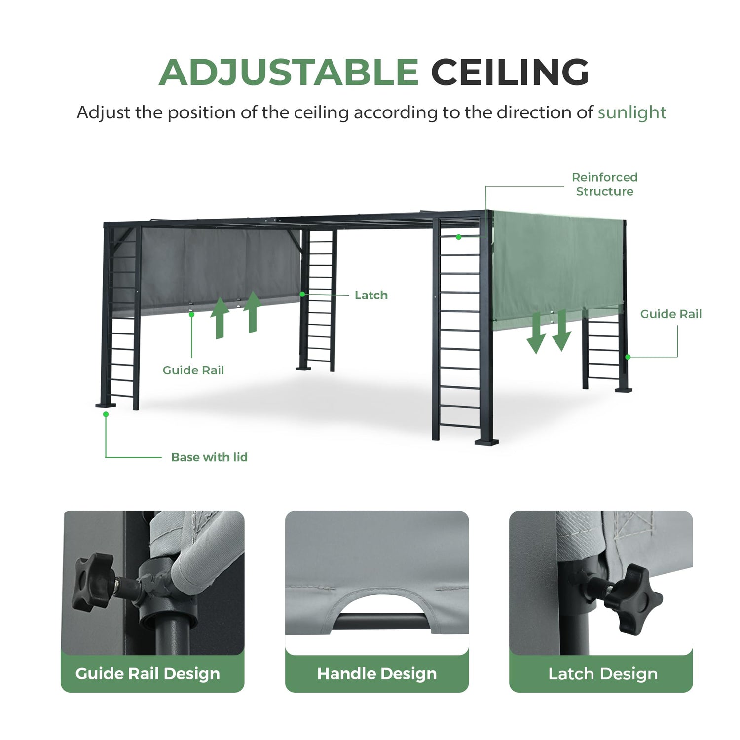 - Fixed Canopy Design: To prevent the canopy from being blown away by the wind and to adapt to sunlight at different angles, our outdoor pergola canopy has a unique latch system that allows the canopy to be fixed in any position you want.