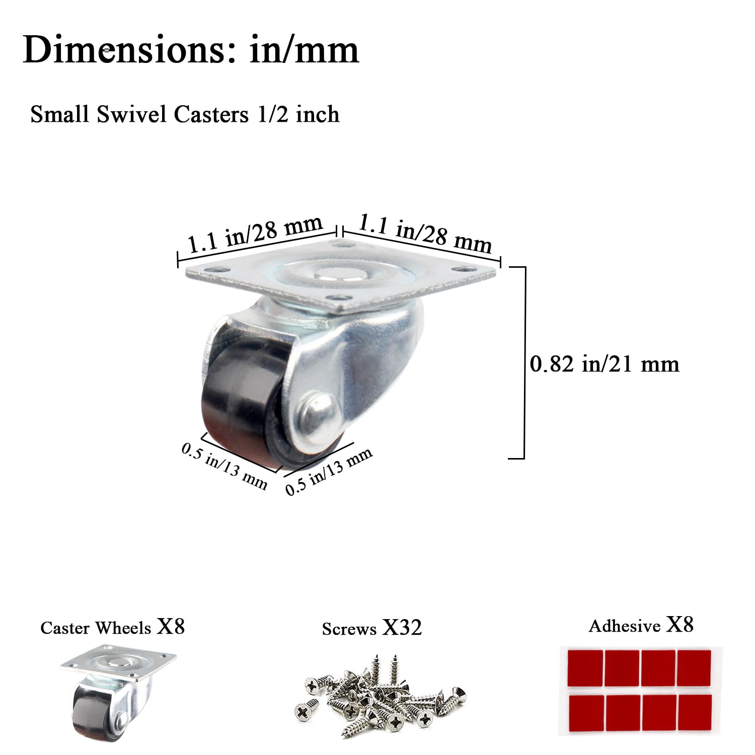 - Small Casters Package & Size: You will get 0.5 inch swivel casters set of 8, incorporate 32 pcs screws and 8 pcs adhesive. Wheel size: 1.1"L x 1.06"W x 0.82"H. Wheel diameter: 0.5"/13 mm. Wheel width: 0.47"/12 mm. Mounting Height: 0.82"/21 mm. Wheel material: steel and nylon. (Note: These casters are mini small type, please kindly check the size before order, thank you!)