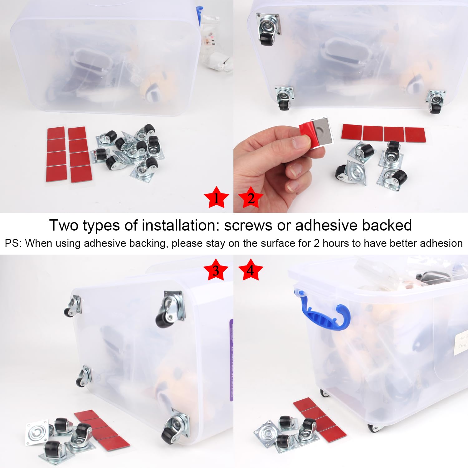 - Easy To Install: Our 1/2 inch mini caster wheels with adhesive are incredibly easy to install - simply peel off one side of the adhesive and stick it onto the mini casters, then peel off the other side and stick it onto your object. We also offer screws for you to choose from for different mounting options.