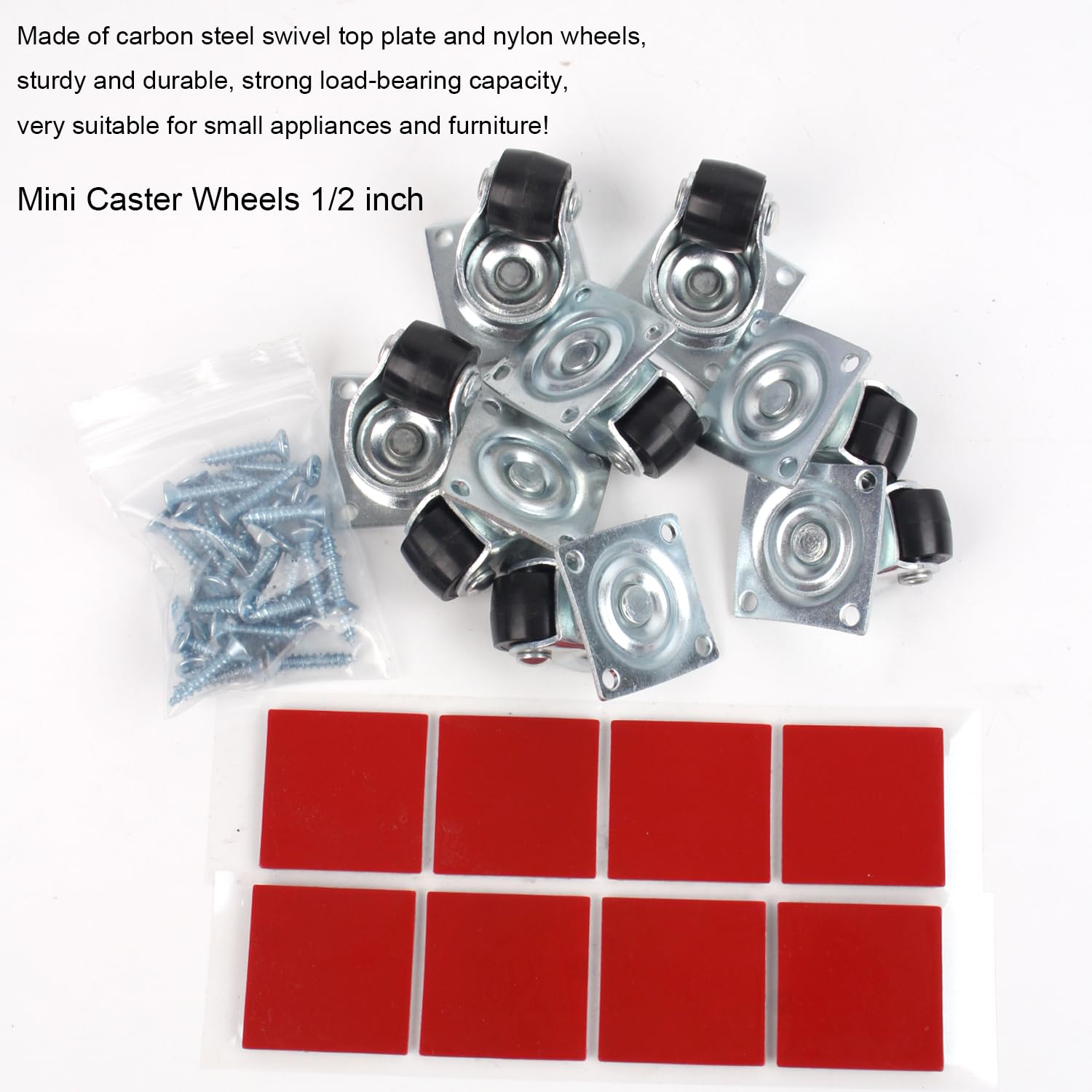 Luxinika Mini Caster Wheels 0.5 Inch Low Profile Swivel Small Casters, Steel Top Plate, Self Adhesive Little Nylon Rolling Wheels for Furniture, Small Appliances, Toy Cart Storage Box & Bins 8 Pack