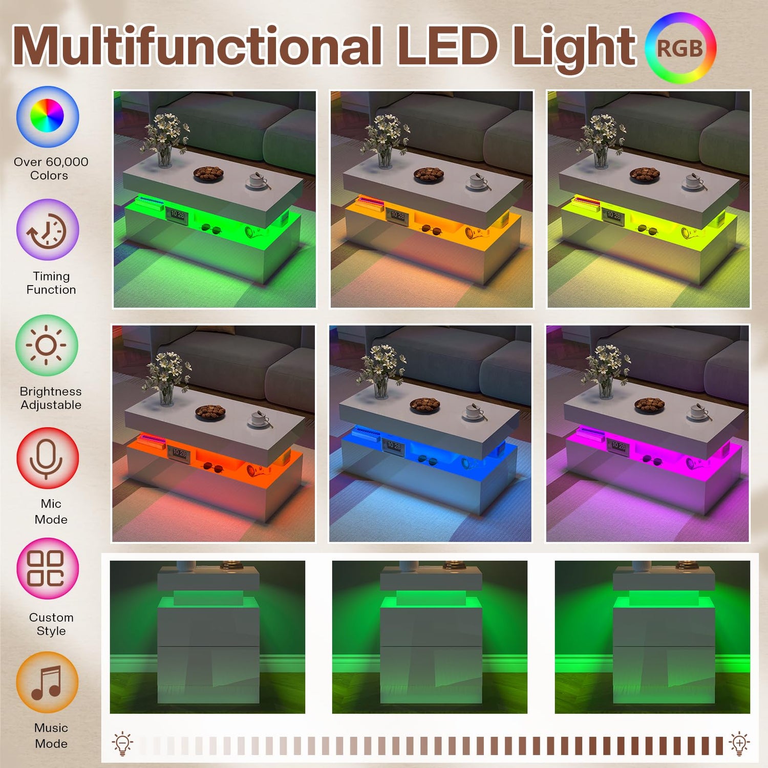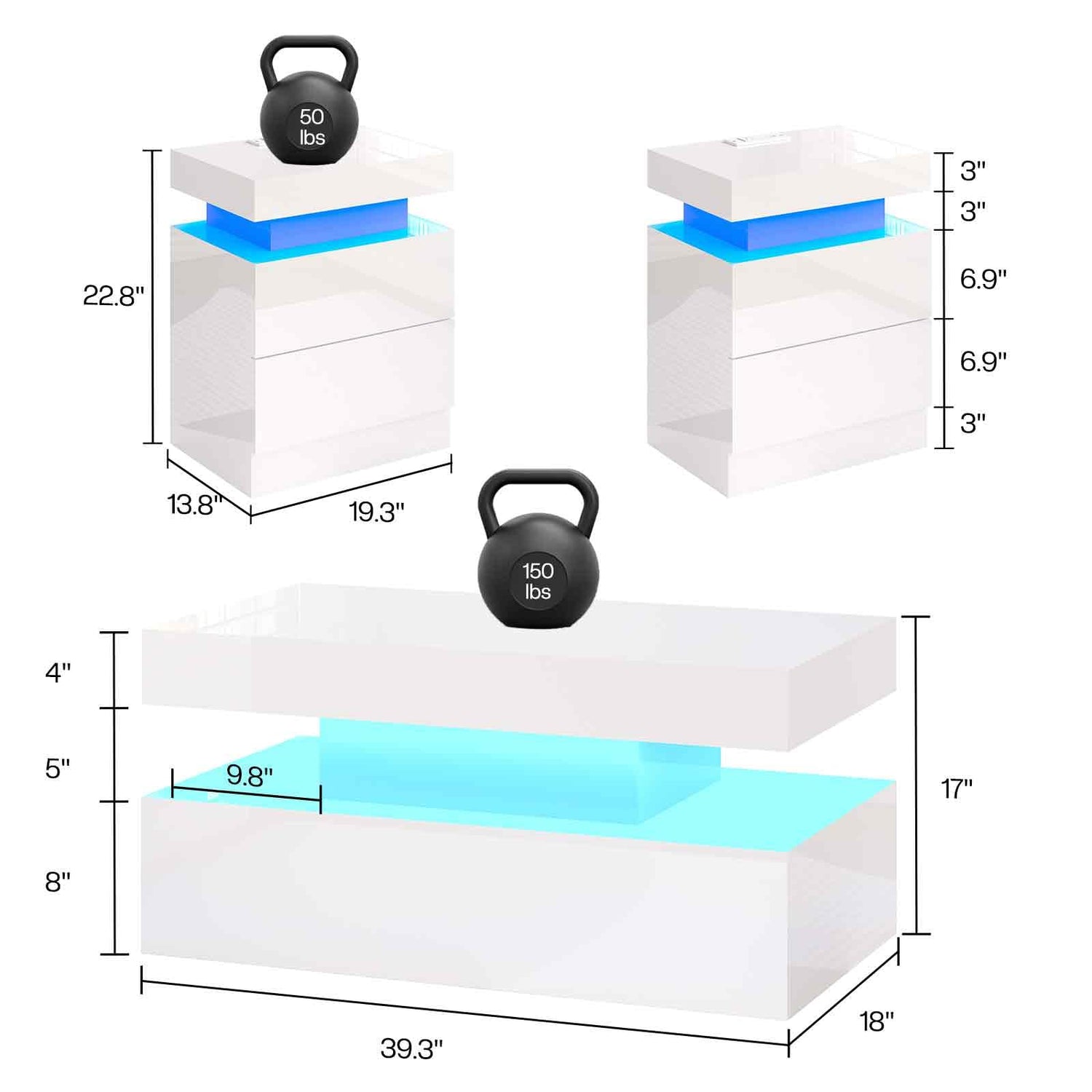 LUXOAK 3 Pieces Living Room Table Set, Modern High Gloss Coffee Table Set with LED Light and Storage Space, 2 End Side Tables with Charging Station for Living Room, Office, White