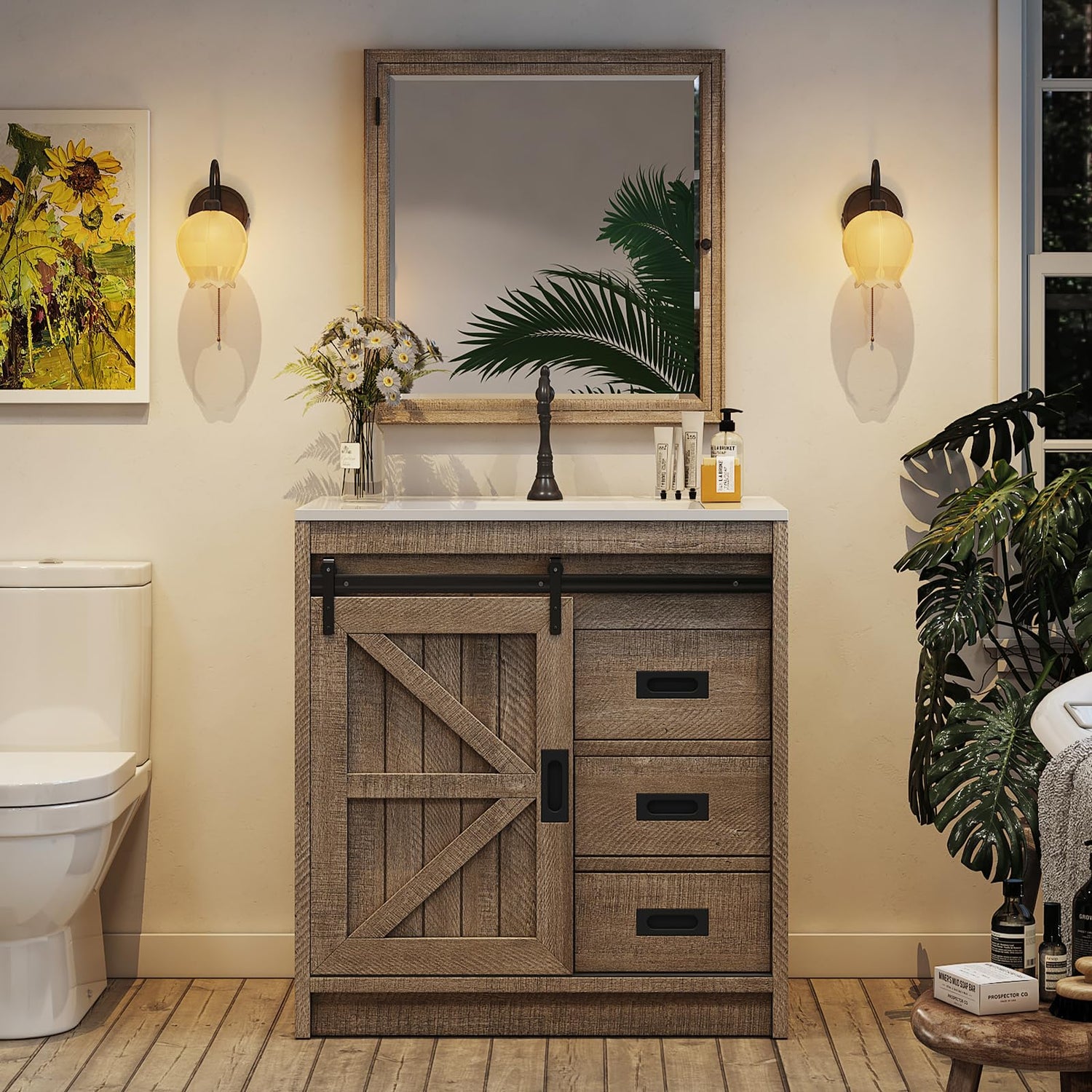 LUXOAK 31" Farmhouse Sliding Barn Door Bathroom Vanity with Sink Combo, Bathroom Vanity Cabinet with Drawers & Metal Handles, Freestanding, Gray