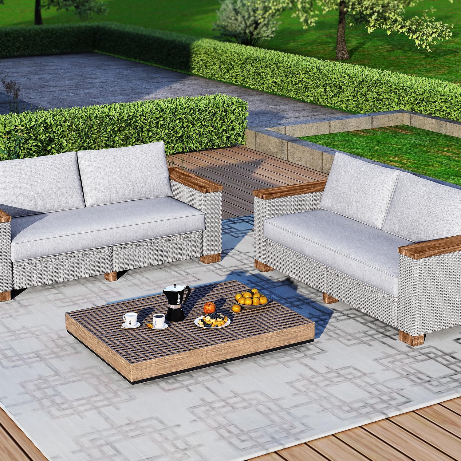 LUXOAK 4-Piece Outdoor Patio Furniture Set, All-Weather Wicker Sofa with 5.9" Solid Wood Armrests, Wooden Legs, and Cushions – Sectional Conversation Set for Backyard, Porch, Garden, or Poolside