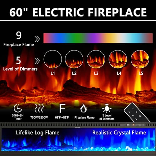 - 60"Glass Electric Fireplace: Fireplace-60" W x 5.5" D x 12.8" H. Large fireplace with 9 flame colors makes a strong visual statement. Extended air outlet radiates more heat energy. Comes with crystal and log set to meet your needs.