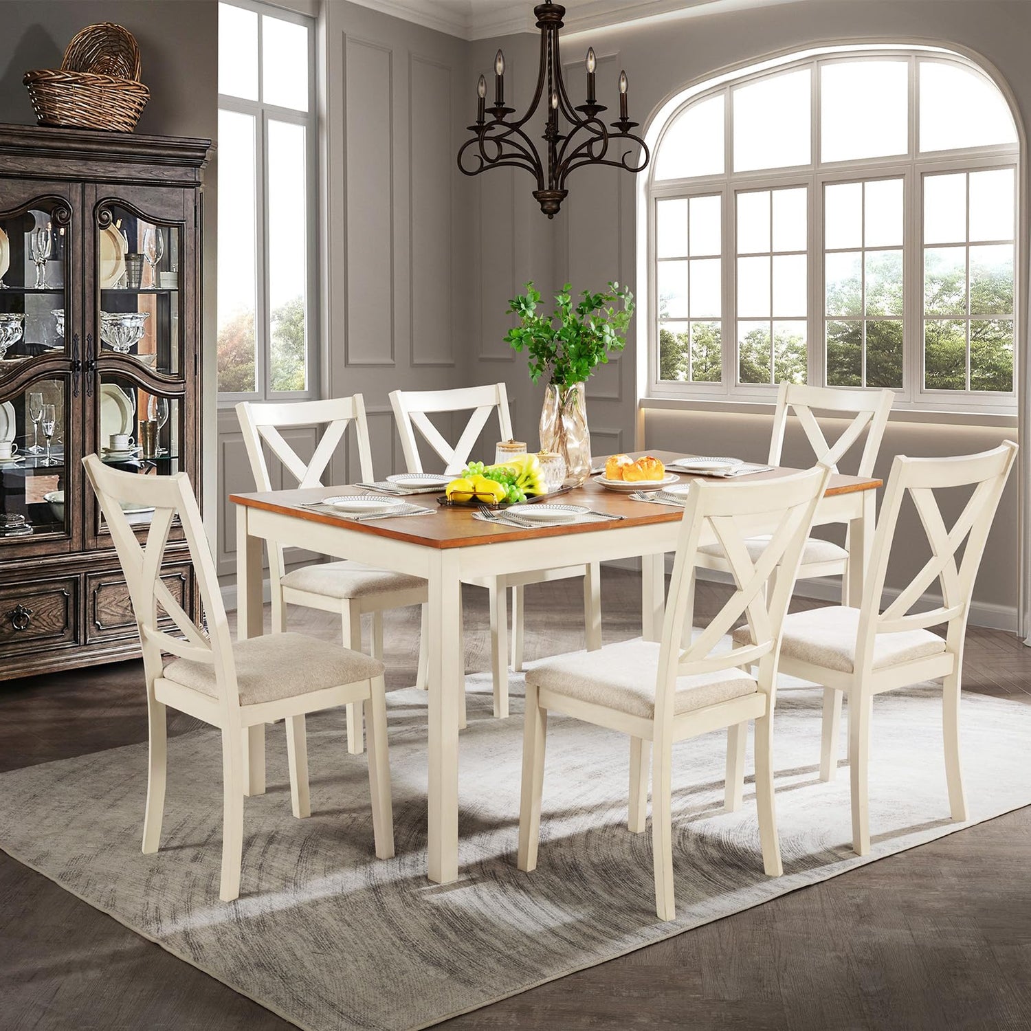 LUXOAK 7-Piece Farmhouse Solid Wood Dining Table Set with 6 Chairs, 60" Rectangular Dining Table & Chair Set for 6 People, Dining Table with Wood Legs, Table Set for Dining room, Kitchen, Rustic Cream