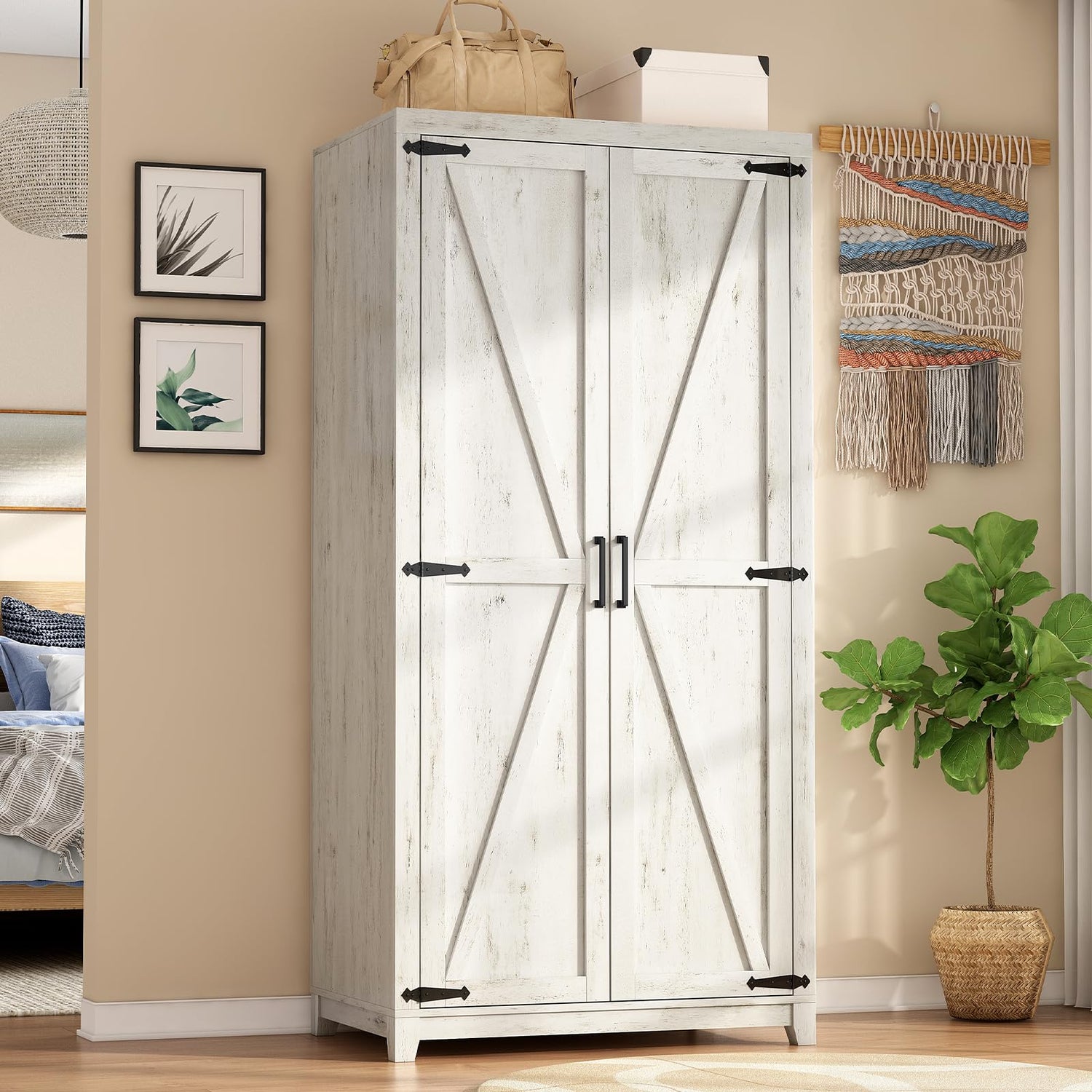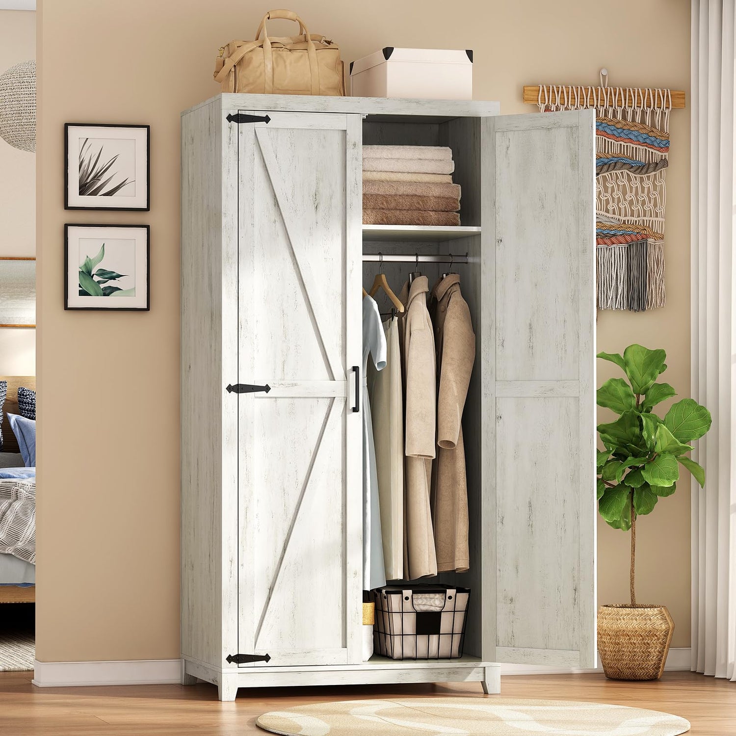 LUXOAK 70" Large Armoire Wardrobe Closet with Hanging Rod, Farmhouse Clothing Storage Cabinet with 2 Barn Doors, Wooden Tall Bedroom Armoires with Shelf, Distressed White