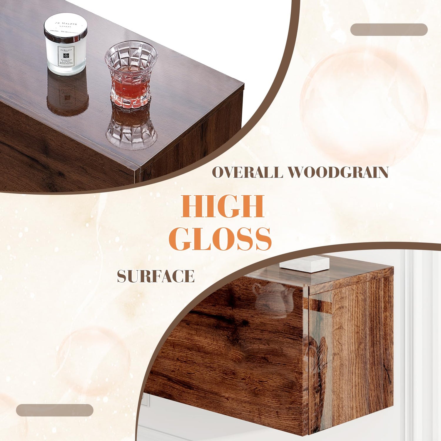 - 【HIGH GLOSS FLOATING DESIGN】Modern floating TV stand with visible wood grain UV high gloss finish, elegant and beautiful, easy to clean surface. The combination of wall mounted TV cabinet design and high gloss makes your room shine and unique.