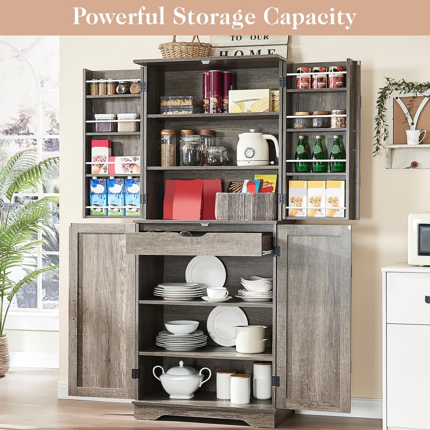 LUXOAK 72" Tall Farmhouse Kitchen Pantry with Rivet Barn Doors, Rustic Wood Cupboard Storage Cabinet/w Drawer & Adjustable Shelves for Dining Living Room, Bathroom & Hallway, Rustic Gray