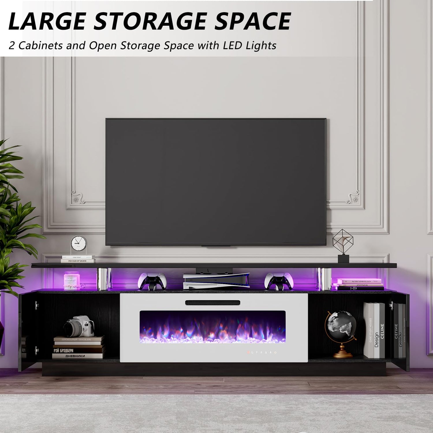 LUXOAK 80" Fireplace TV Stand, Modern High Gloss Finish Media Console with 40" Electric Fireplace, Open Storage Entertainment Center for TVs Up to 90" with LED Lights, Black/White