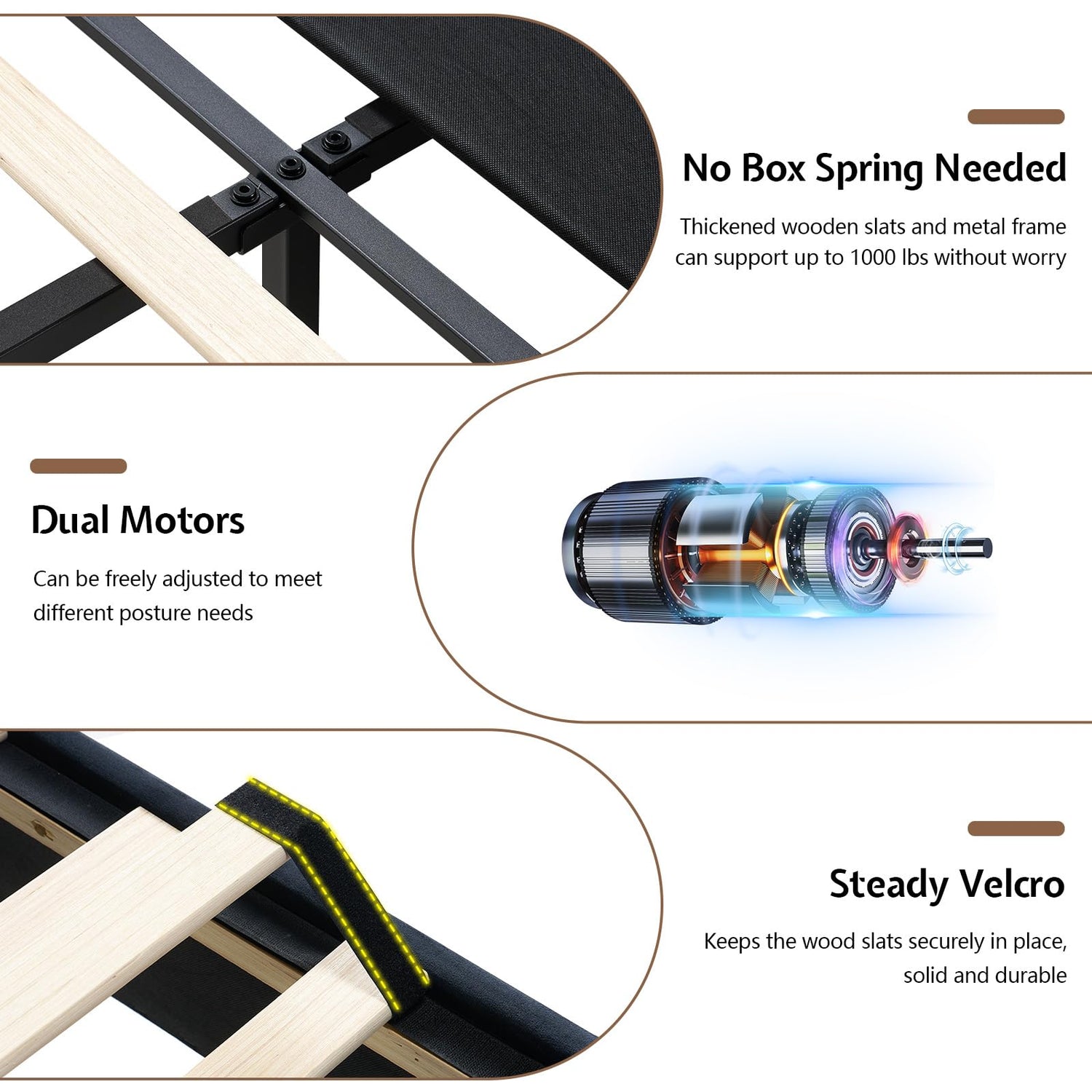 - 【Sturdy & Solid】Low-noise dual motors have passed fatigue tests to ensure superior quality and durability. Sturdy metal support legs and thickened wooden slats ensure the stability of the platform bed