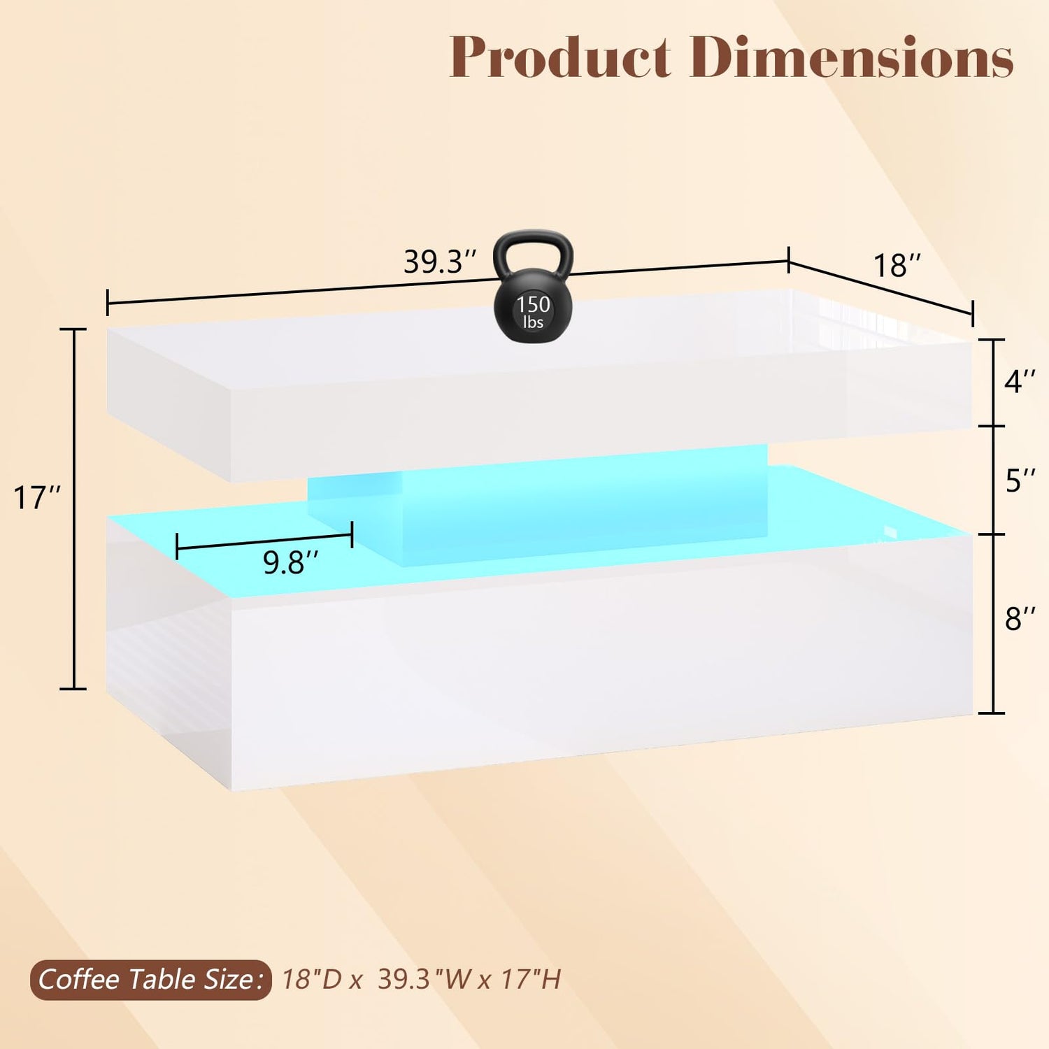 LUXOAK Coffee Table with LED Light, Modern High Gloss Finish Center Table with 2-Tier Storage Space, Minimalist Coffee Table for Living Room, Office, White