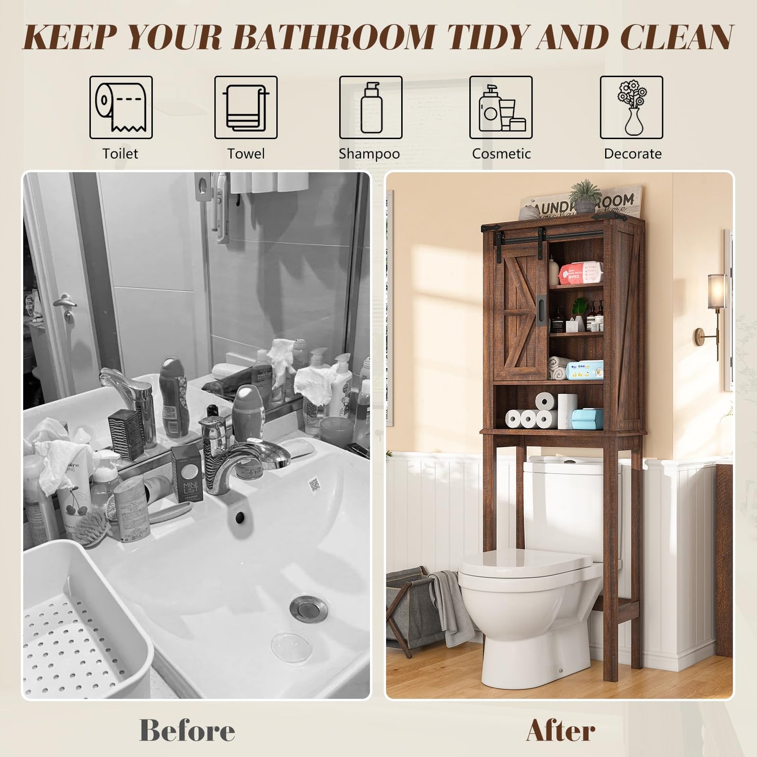 - 【Farmhouse Barn Door Design】Over the toilet storage cabinet has sliding barn door, combining modern and rustic elements for an elegant look for ideal use above toilet or washing machine, complements any furniture decor.