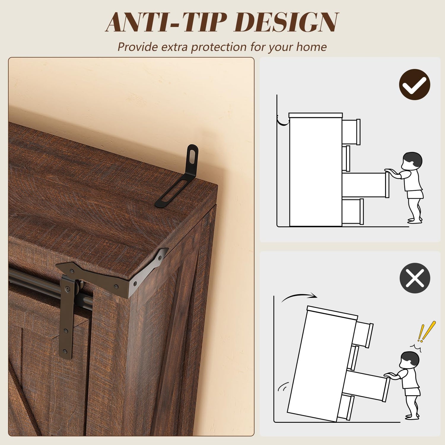 - 【Sturdy & Durable Structure】With heavy wood, farmhouse storage cabinet offers stable support. 2 Anti-tipping metal parts securely fasten the cabinet to wall, preventing wobbling or tipping over.