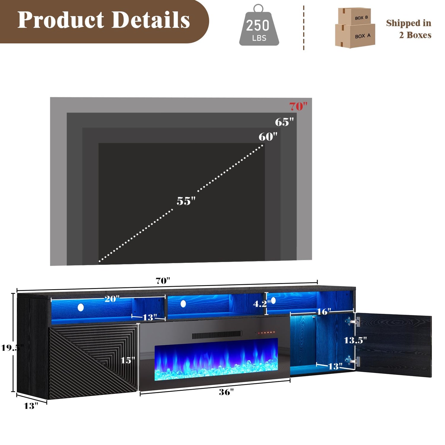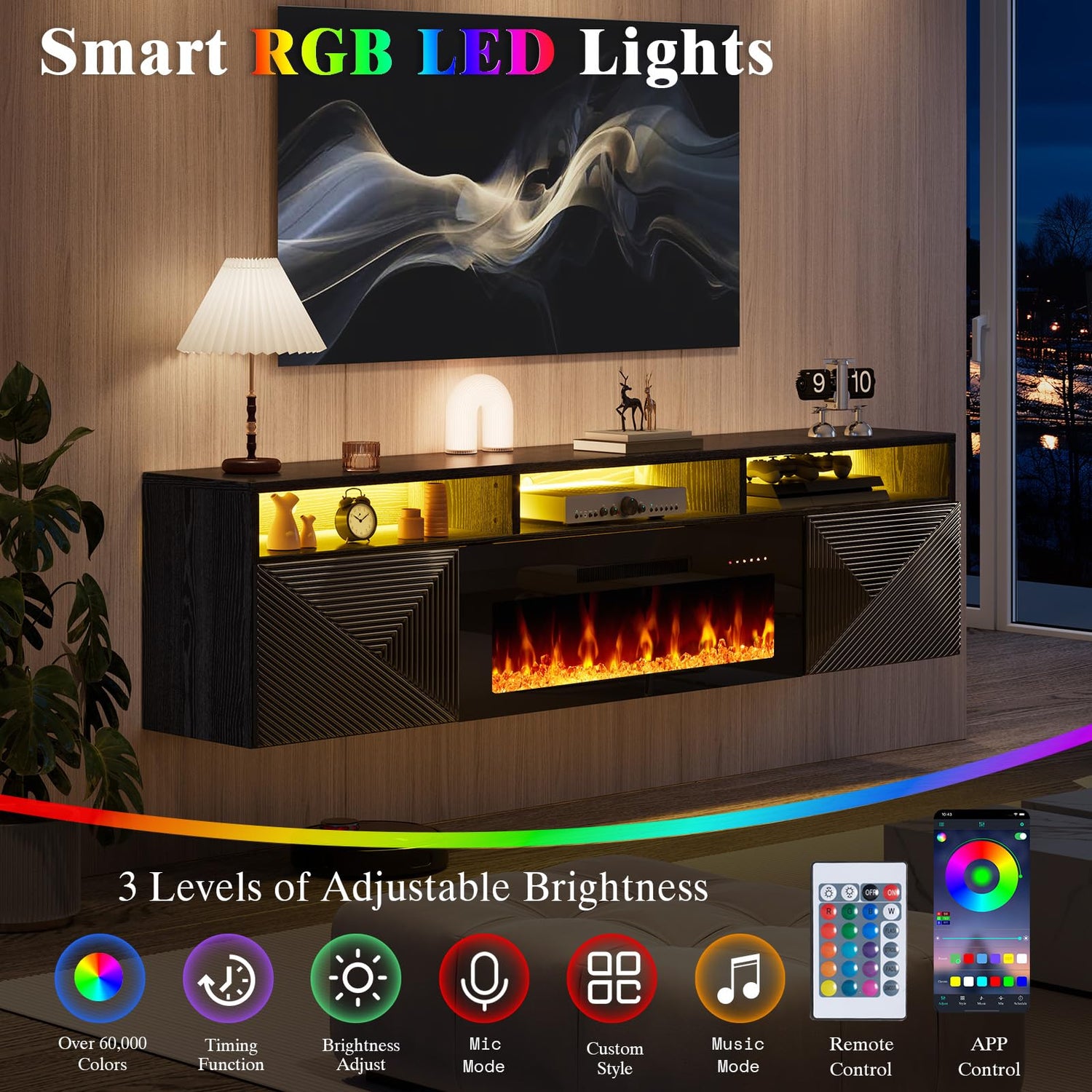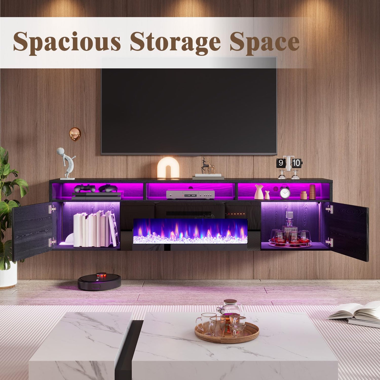 LUXOAK Floating TV Stand with 36" Electric Fireplace, 70 inch Wall Mounted Electric Fireplace Entertainment Center with Storage Space, TV Stand for Living Room for TVs Up to 80", All Black