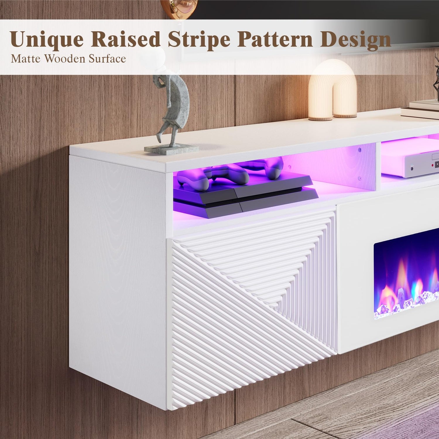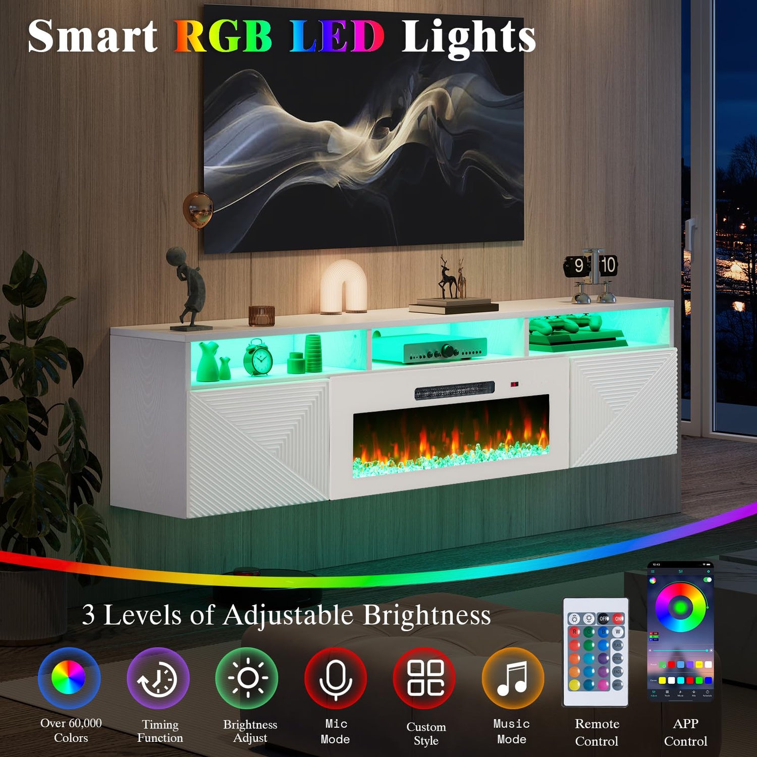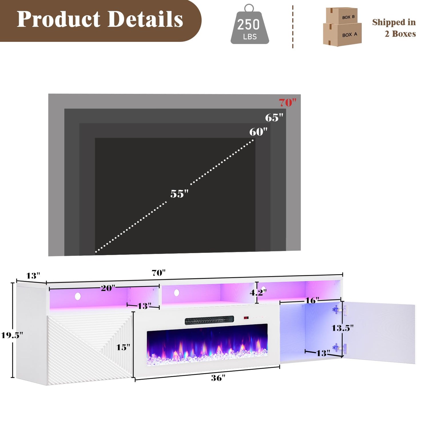 LUXOAK Floating TV Stand with 36" Electric Fireplace, 70 inch Wall Mounted Electric Fireplace Entertainment Center with Storage Space, TV Stand for Living Room for TVs Up to 80", All White