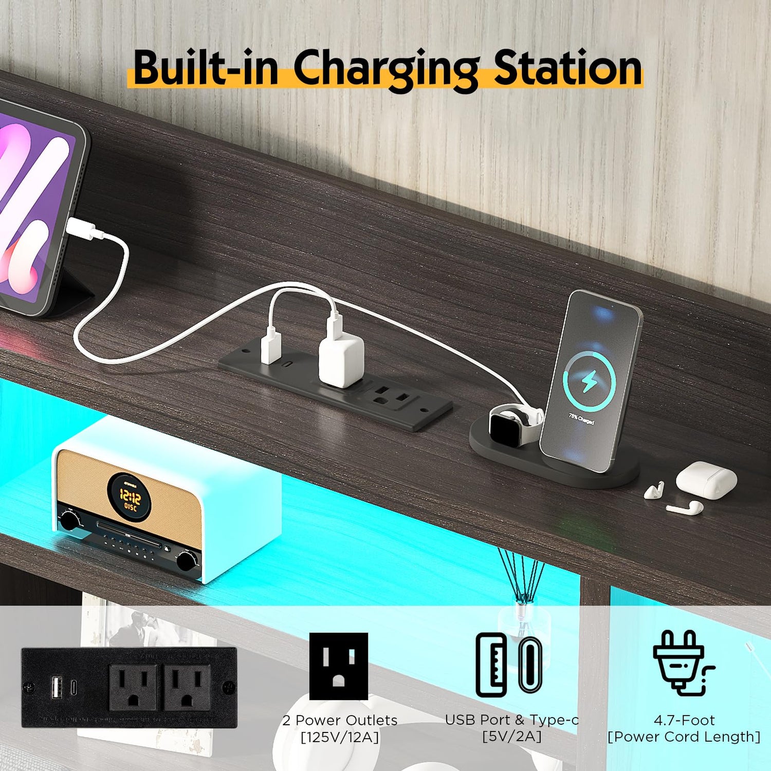 - 【Charging Station】Built-in charging station of the upholstered platform bed is equipped with 2 AC outlets, 1 USB port and 1 Type-c, which is convenient for you to charge phones, tablets and other electronic devices