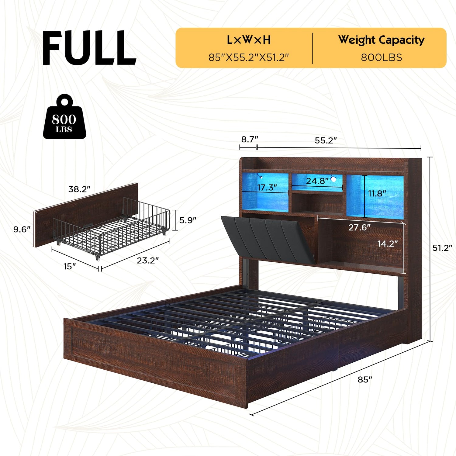 LUXOAK Full Farmhouse Bed Frame with Bookcase Headboard and 4 Drawers, LED Storage Bed with Charging Station & Linen Upholstered, No Box Spring Needed, Reclaimed Barnwood