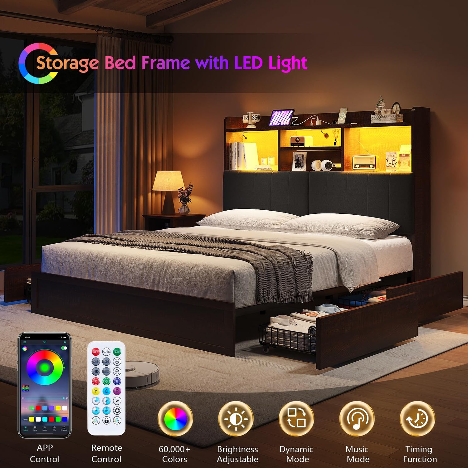 - 【Multi-Functional Storage Space】Wooden Bed frame has 4 under-bed drawers, bookcase headboard with 5 open storage spaces & 2 hidden large spaces. Maximize storage space to easily meet your storage needs