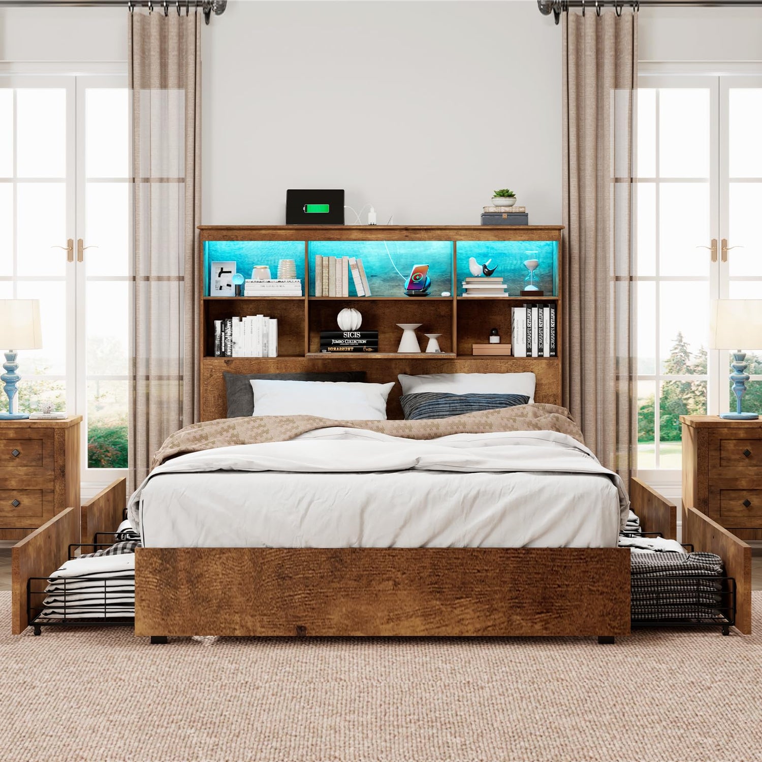 LUXOAK Rustic Brown Full Size Bed Frame with LED Bookcase Headboard, Charging Station & 4 Drawers – No Box Spring Needed