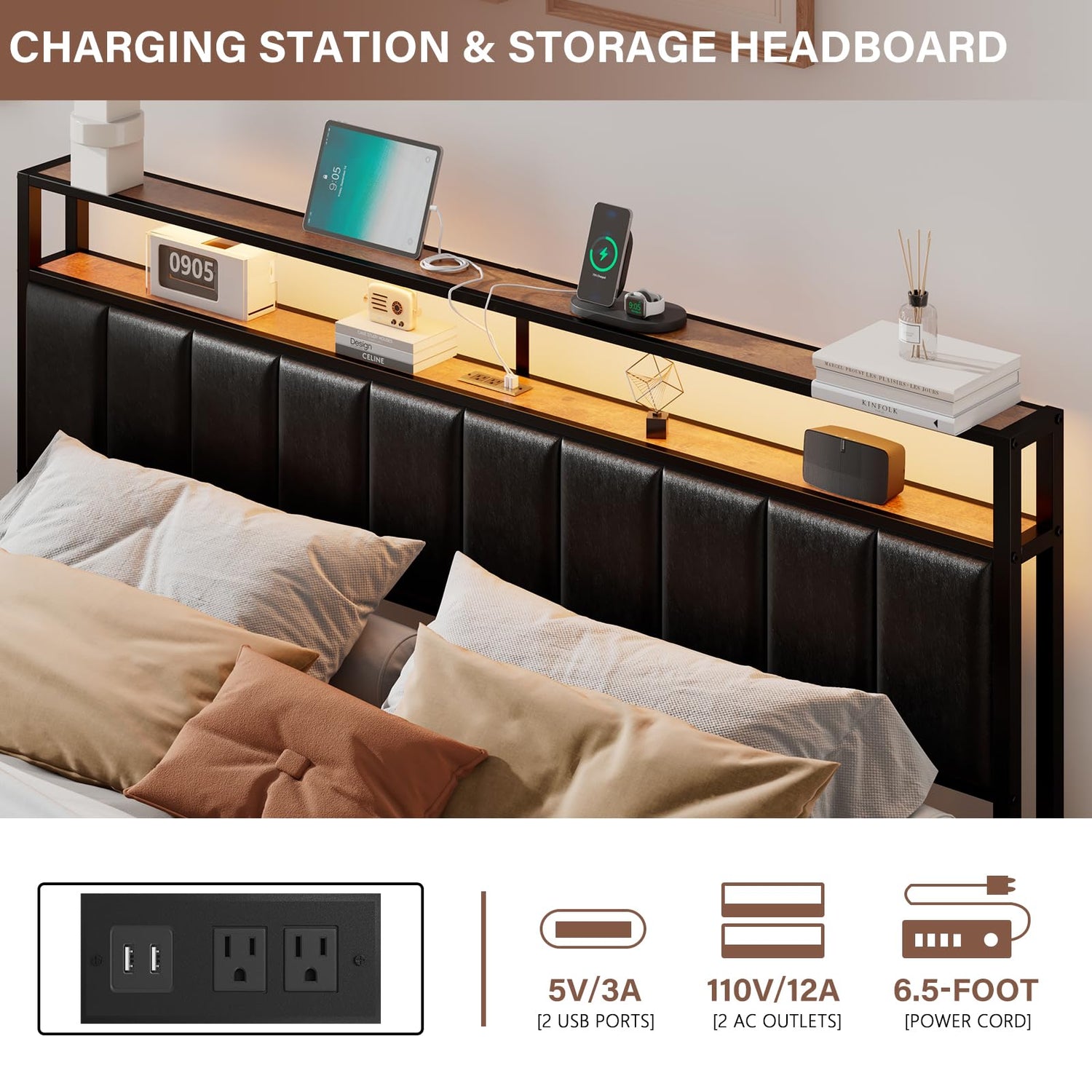 LUXOAK King Bed Frame with RGB LED Lights, 2 Drawers, and Charging Station in Black