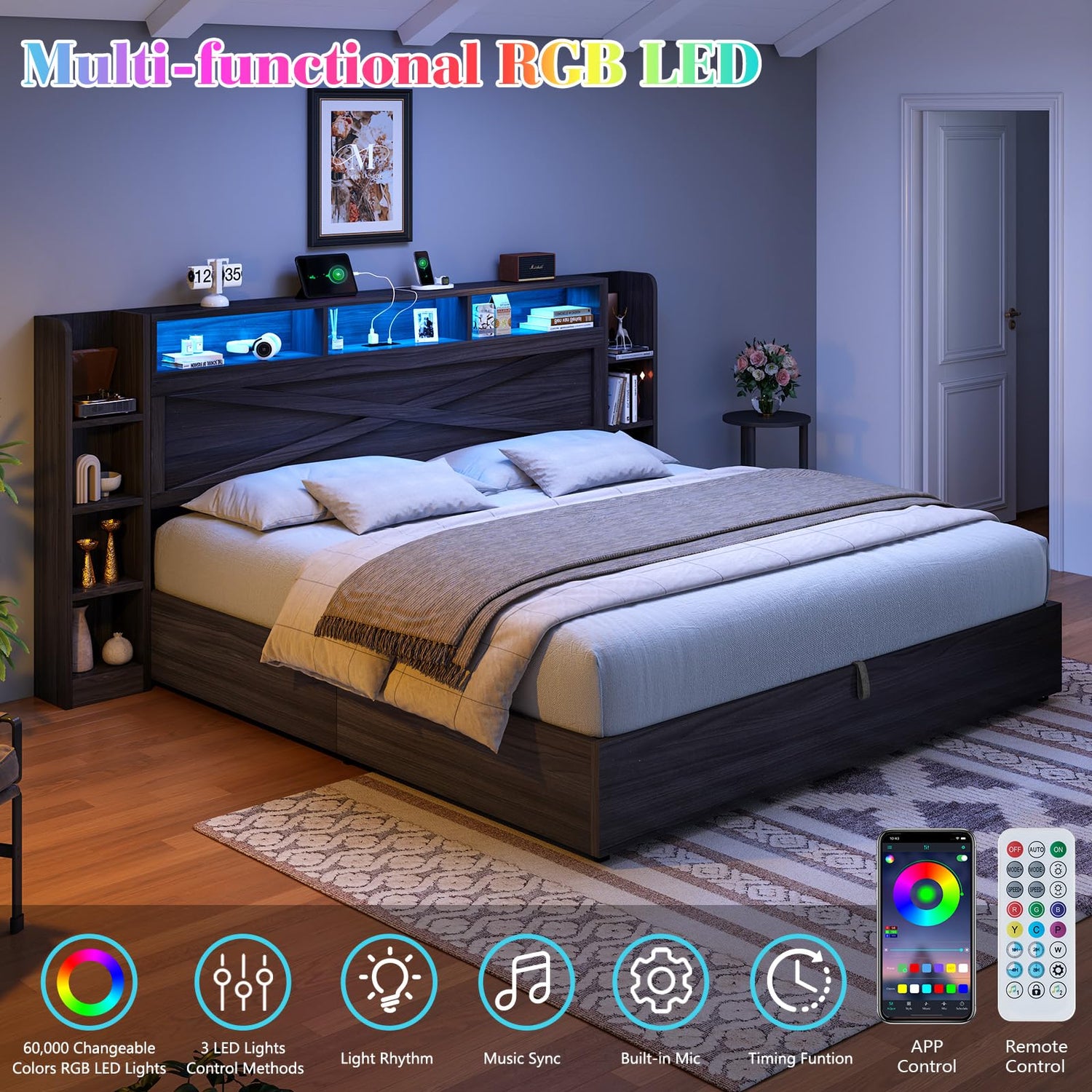 LUXOAK King Size Lift Up Bed Frame with Bookcase Headboard & 2 Side Shelf, Farmhouse Storage Bed with LED Light and Charging Station, No Box Spring Needed, Noise-Free, Black Oak