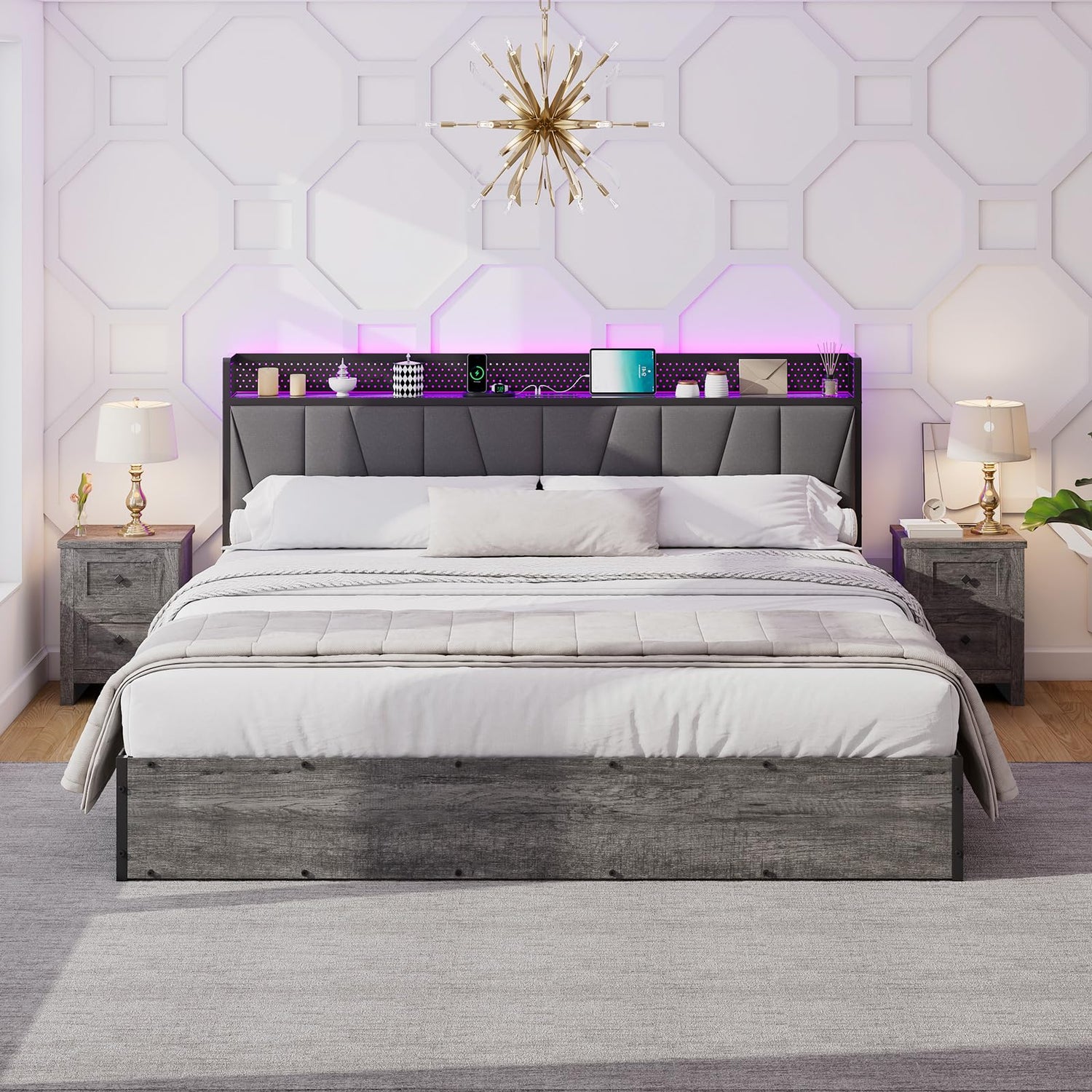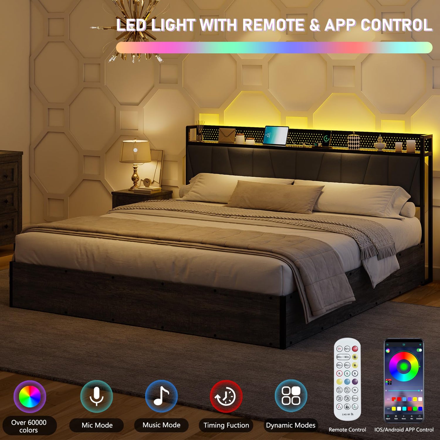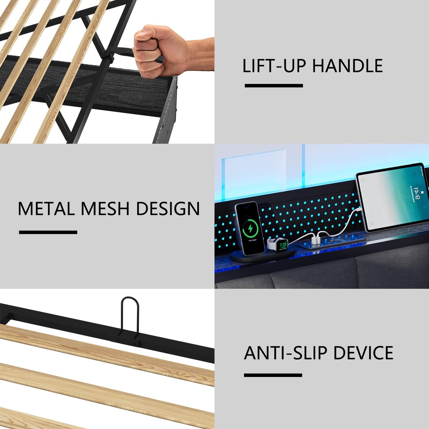 LUXOAK King Size Lift Up Storage Bed Frame with LED Lights, Linen Upholstered Headboard with Charging Station, Wooden LED Light Platform Bed Frame, No Spring Box Needed, Rustic Grey