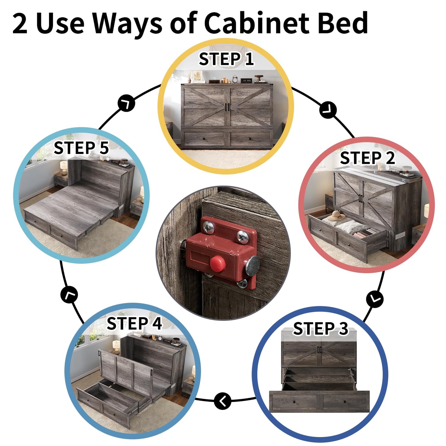 LUXOAK Murphy Bed Queen Size, Cabinet Bed with Charging Station Large Storage Drawer for Home Office or Small Room, Hideaway Bed Full Foldable Platform Bed, Rustic Grey