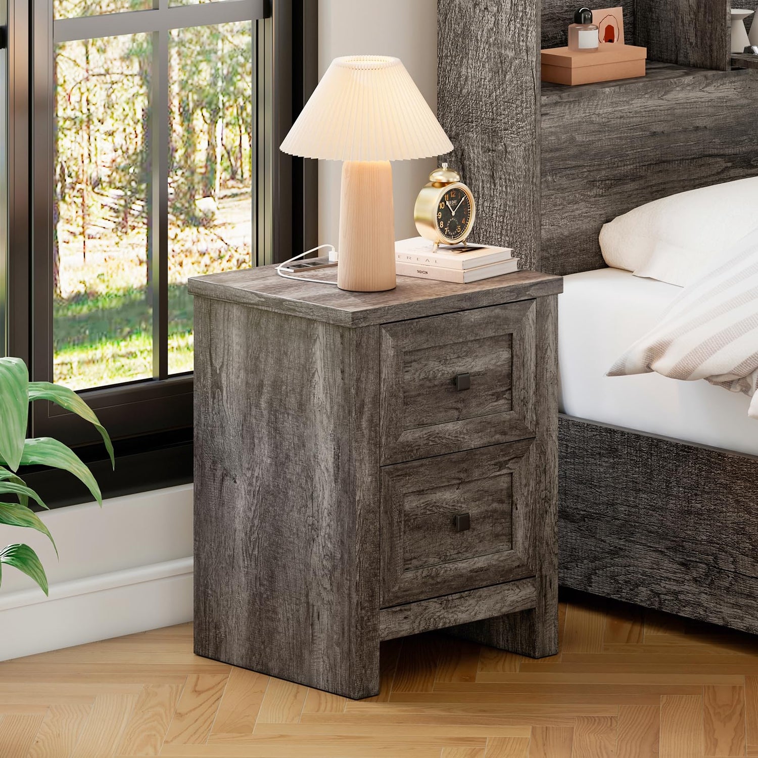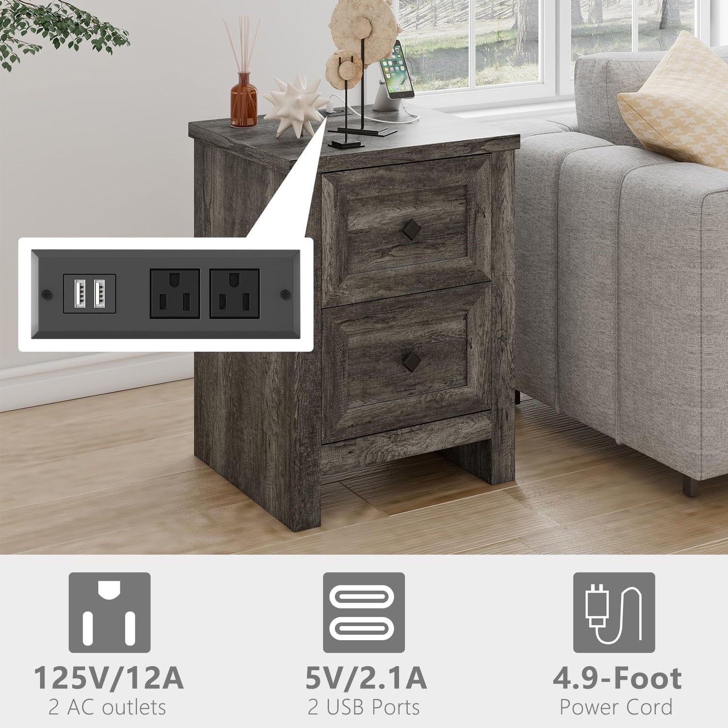 LUXOAK Nightstand Set of 2 with Charging Station, Farmhouse End Table with 2 Drawers Storage Cabinet, Rustic Wood Sofa Side Table for Bedroom, Living Room, Office, Grey
