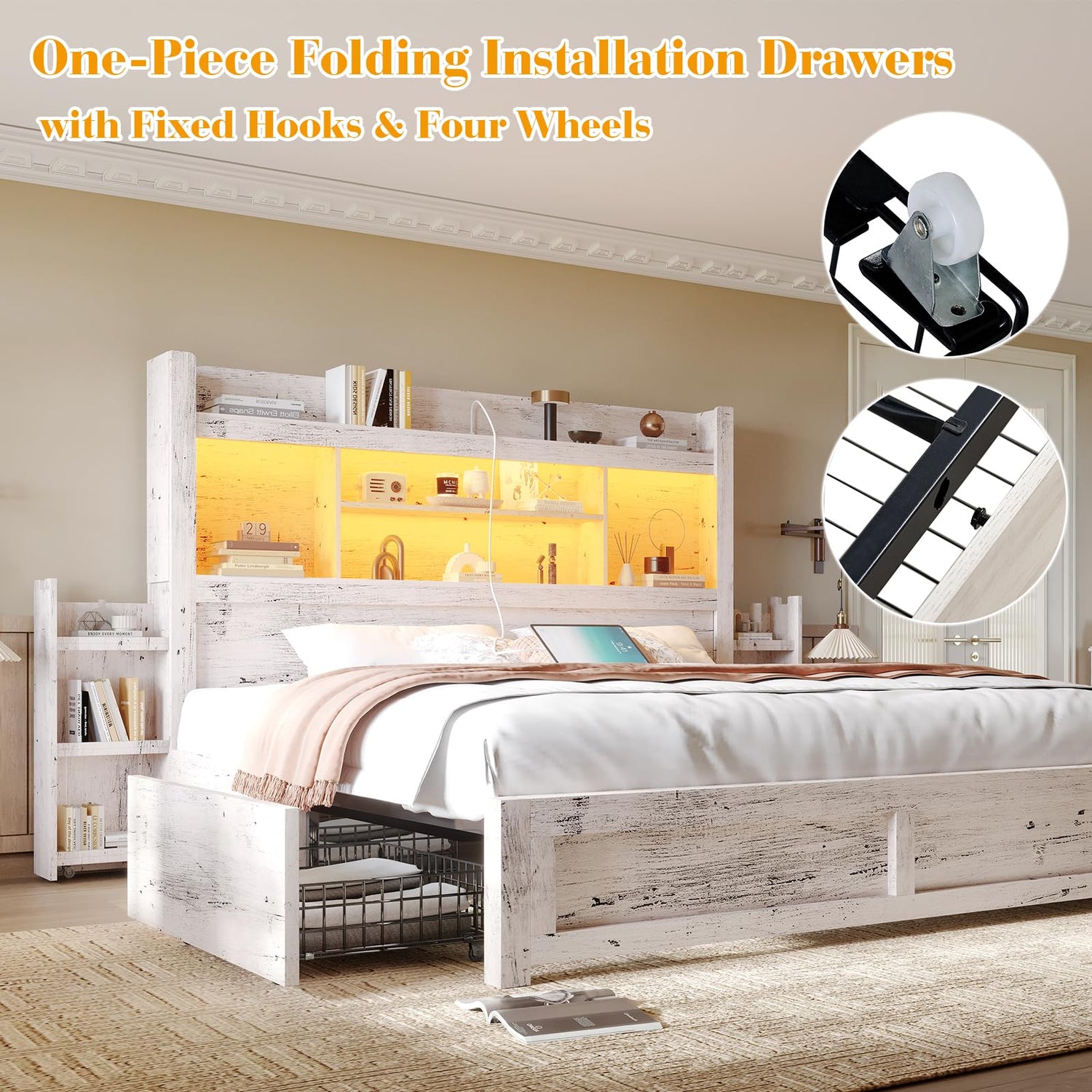 - 【4 Drawers & 2 Detachable Side Racks】Maximize your space with 2 removable side racks, integrate into headboard or use as bedside tables and 4 rolling drawers, foldable for easy assembly, each with a secure latch.