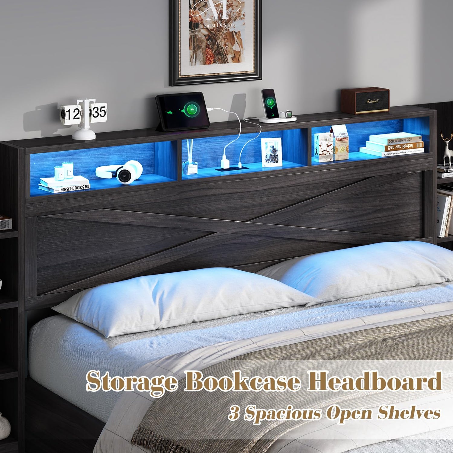 - 【Smart LED Headboard】Bookcase Headboard comes with over 60,000 colors RGB LED light. Freely set the color mode and design your light show. Designed with charging station includes 2 AC Outlets, 1 USB Port and 1 Type-c Port