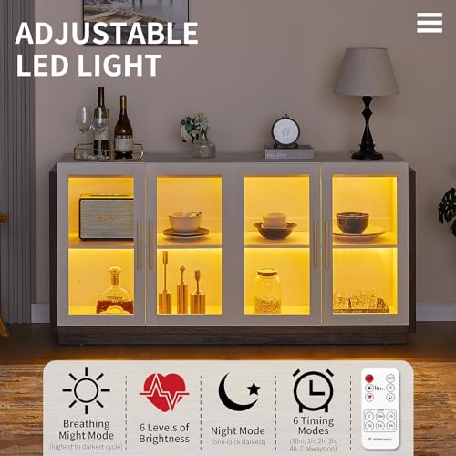 LUXOAK Sideboard Buffet Cabinet with Storage,64" Kitchen Sideboard with LED Light,Modern Wood Glass-Buffet Cabinet for Dinning Room,Kitchen,Hallway,and Living Room,White&Grey