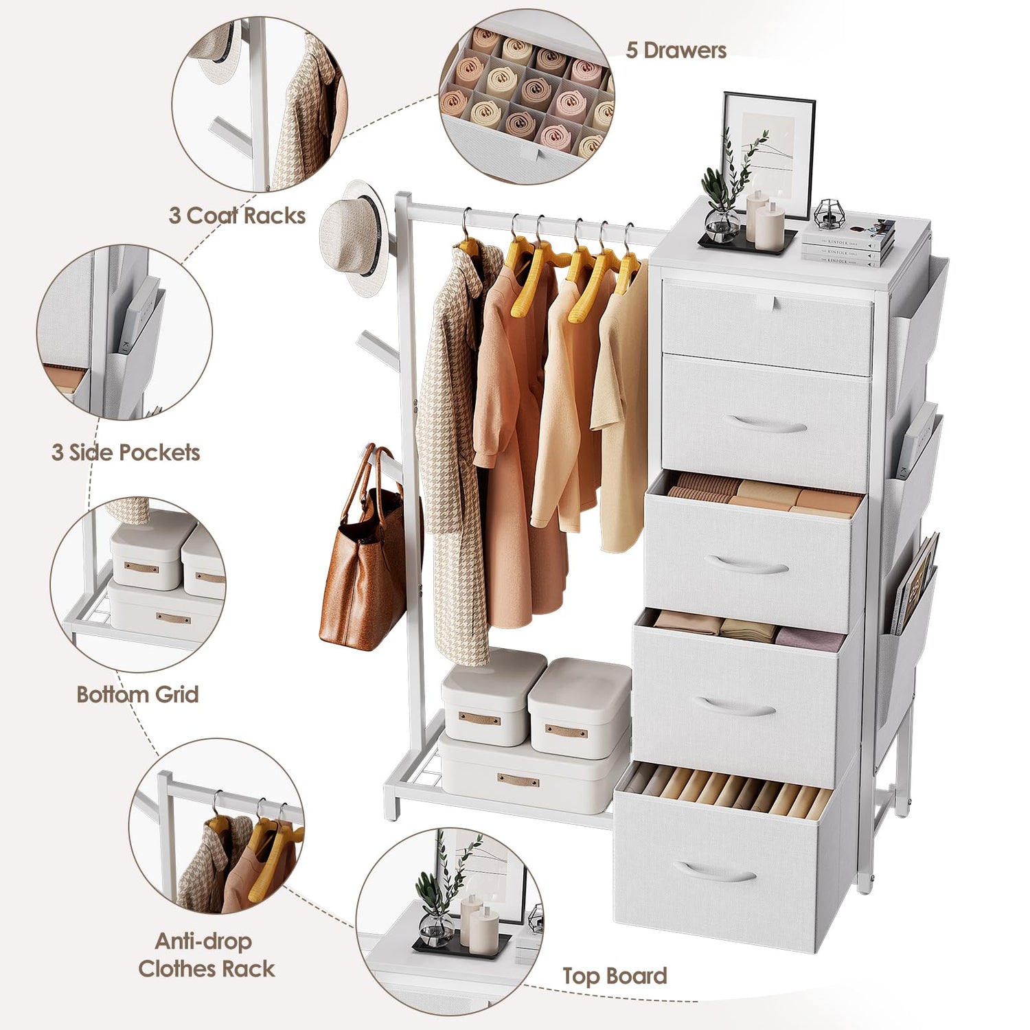 Luxspire Dresser with Hanging Rack, Reversible Dresser for Bedroom with 5 Fabric Drawers & 3 Coat Racks & Side Pockets Small Dressers with Clothes Racks, White