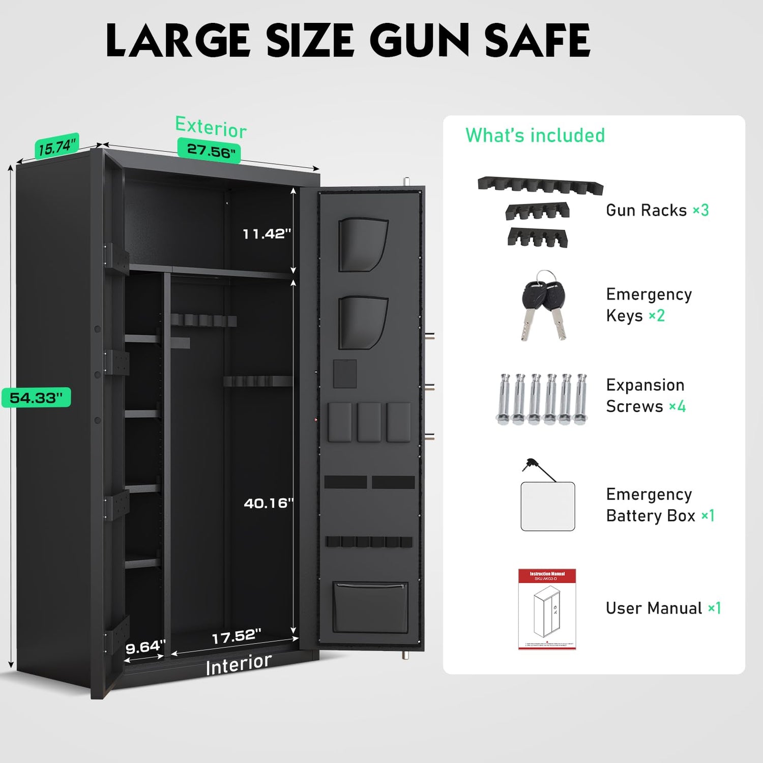 - 【Upgraded Double Door, Super Capacious Gun Safe】Our rifle safe features a spacious double-door design with a larger/deeper interior, easily holding ~40 pistols/rifles, up to 50" long. It comes with 3 flexibly adjustable or removable gun racks inside, allowing you to find the perfect placement for guns of any size. A top extension slot conveniently stores extra-long guns without disassembly.