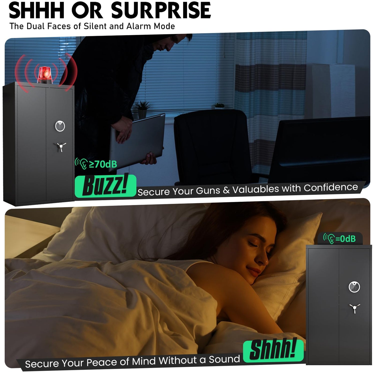 - 【Upgraded Dual Alarm System, Silent Mode】 This gun safes & cabinets offers upgraded security! The dual alarm system is always on standby: Incorrect password 3 times? Wrong fingerprint 5 times? Shaken or impacted? The alarm triggers instantly! A loud 70dB alarm deters intruders. New silent mode for quiet use. Solid home protection by Luzfuego.