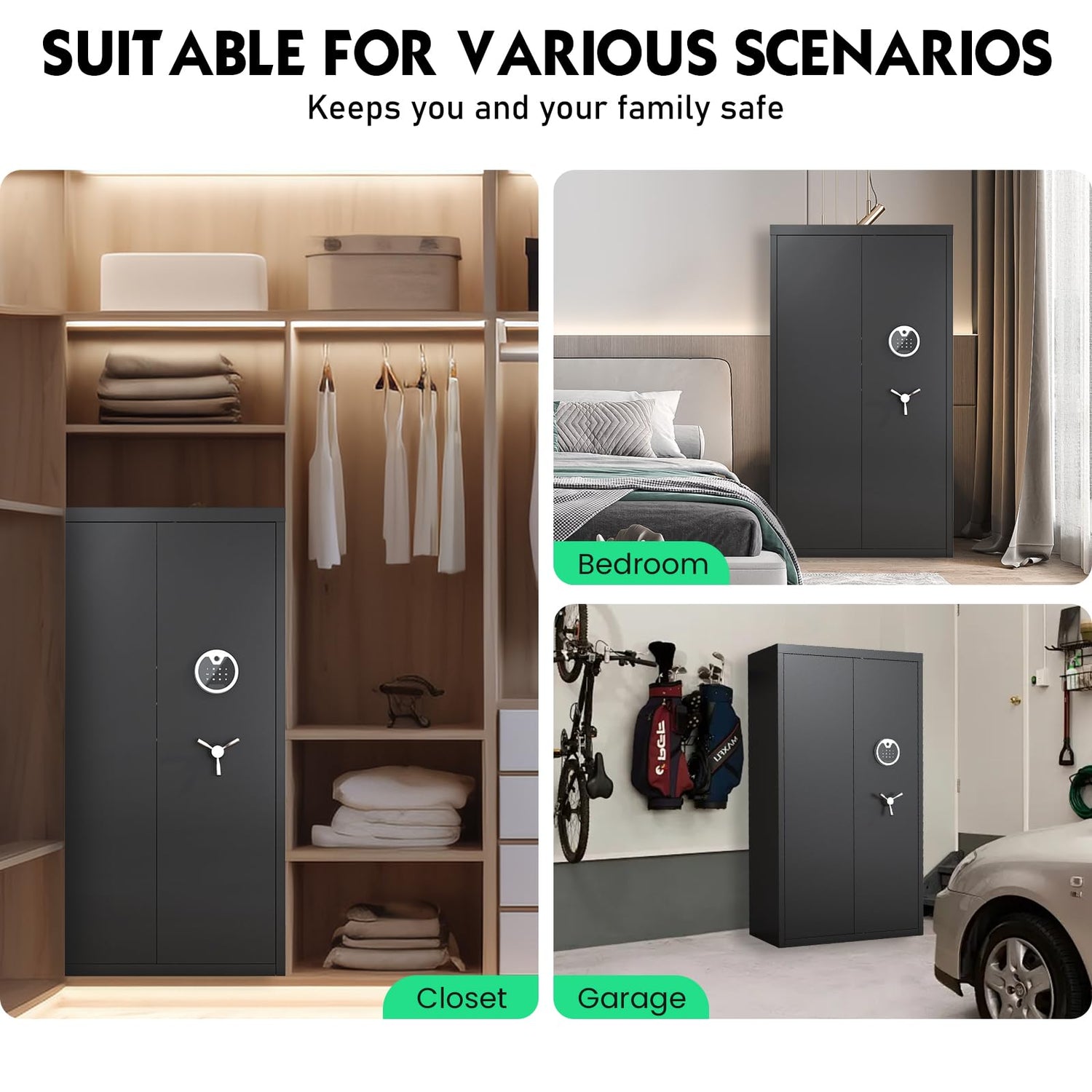 - 【Multi-functional Gun Cabinet】This large gun cabinet features a clearly organized interior layout. It is specially equipped with 4 freely movable and adjustable shelves on the left side, meeting your personalized storage needs. The inside of the cabinet door also features multi-functional storage compartments for pistols, ammunition and metal storage boxes, allowing you to easily sort and store your firearms and accessories by category.