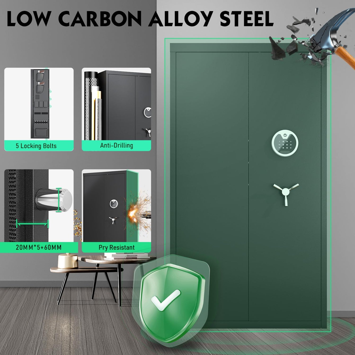 - 【Enhanced Security Rifle Gun Safe】This rifle cabinet is crafted from high-quality low-carbon alloy steel, ensuring robustness and reliability. The left and right door panels are connected by three powerful locking bolts, combined with 20mm solid steel locking bolts that securely fasten from three sides. Paired with 60mm thick solid steel door panels, this design comprehensively enhances anti-theft and anti-prying performance, constructing a solid defense for your firearms.