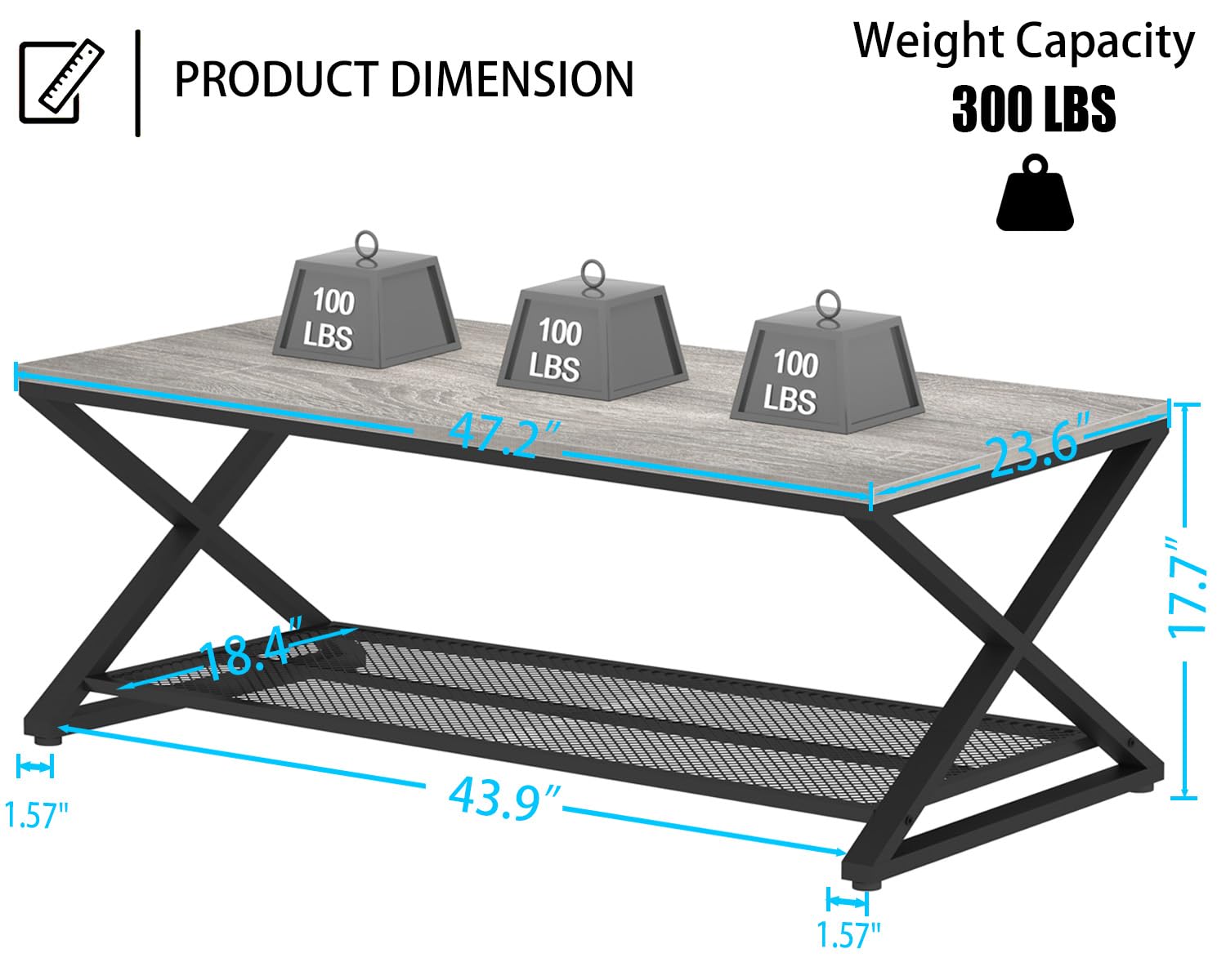 LVB Gray Coffee Table, Farmhouse Wood Metal Center Table with Storage for Living Room, Industrial Wooden 2 Tier Rectangle Cocktail Tea Table with Mesh Shelf for Office Bedroom, 47 inch, Light Grey Oak