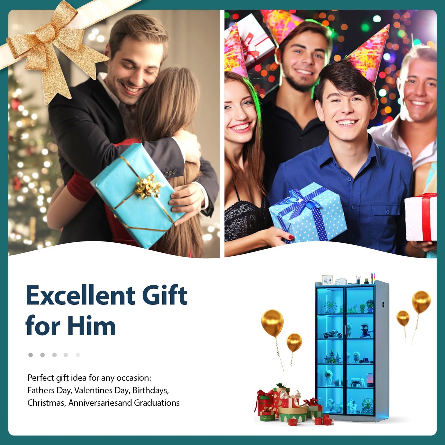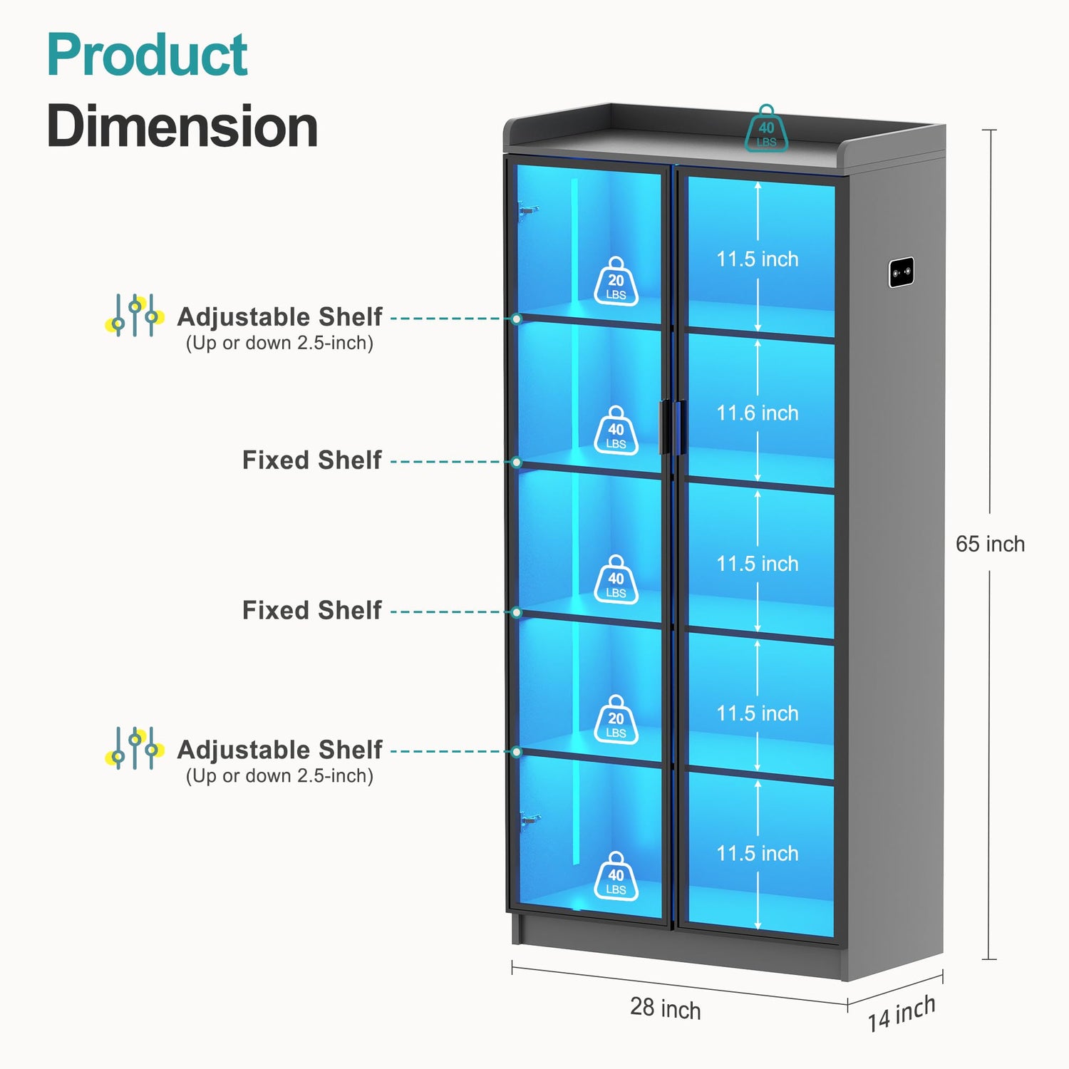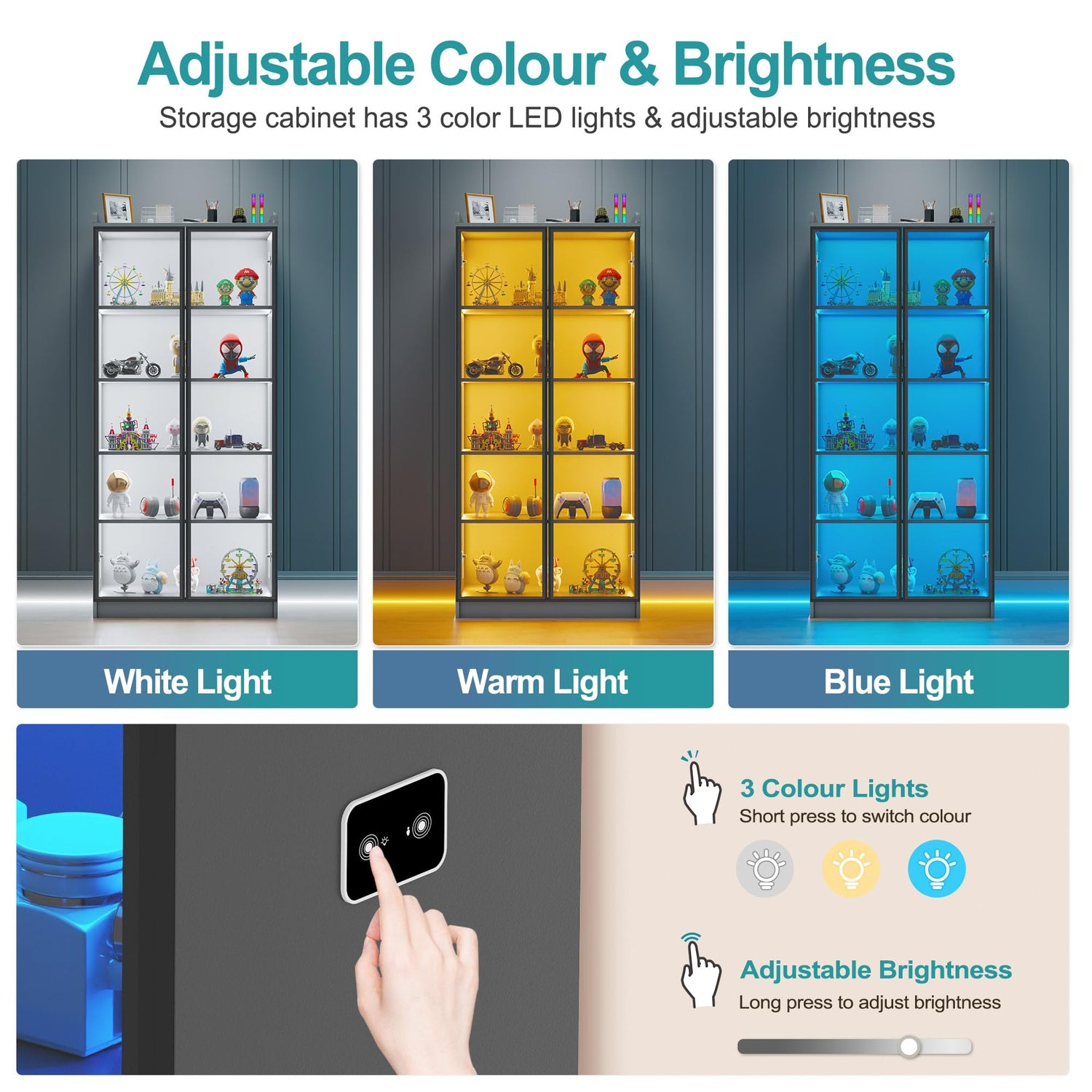 - ✨【3 Dimmable Lights & Body Sensor】 - The curio cabinet has 3 color LED lights (Warm, Blue, White) & adjustable brightness. With human body induction, the lights will auto turn on/off when someone approaches/leaves