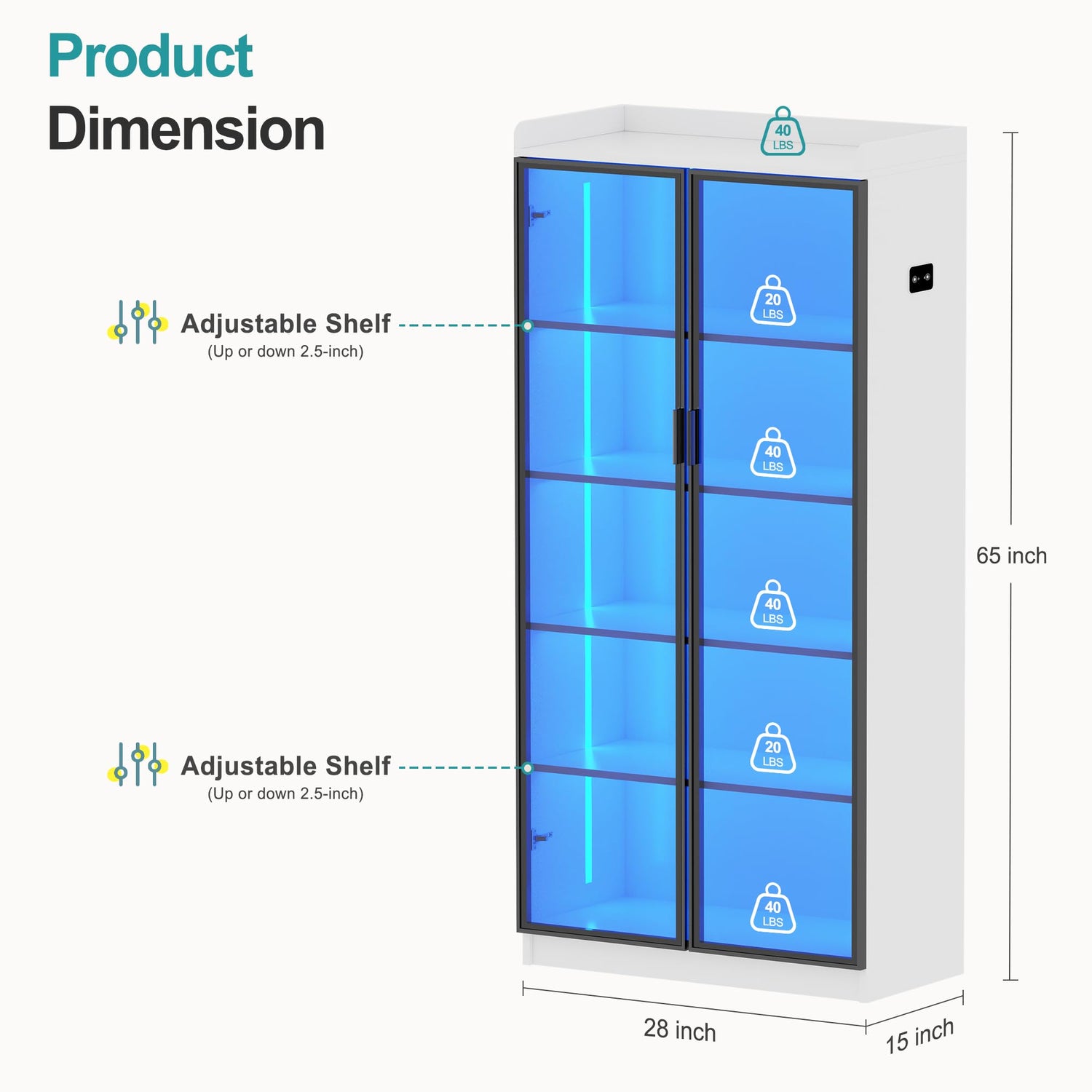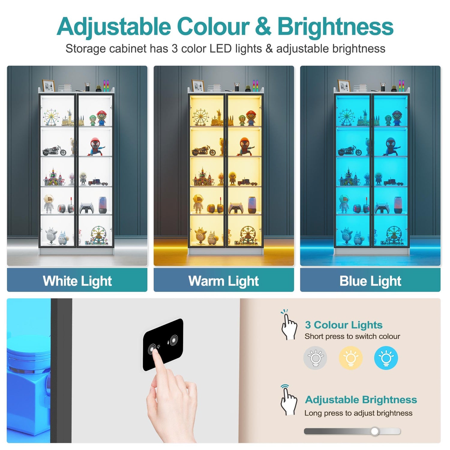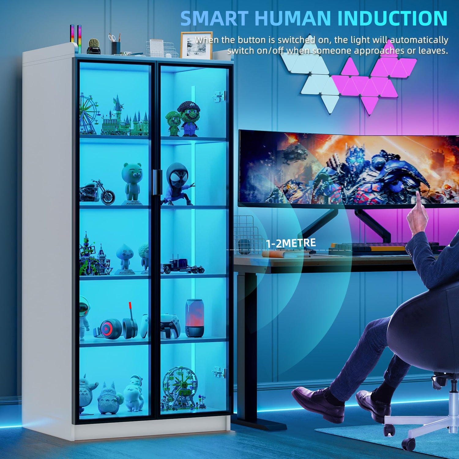 - 【3 Dimmable Lights & Body Sensor】 - The curio cabinet has 3 color LED lights (Warm, Blue, White) & adjustable brightness. With human body induction, the lights will auto turn on/off when someone approaches/leaves.