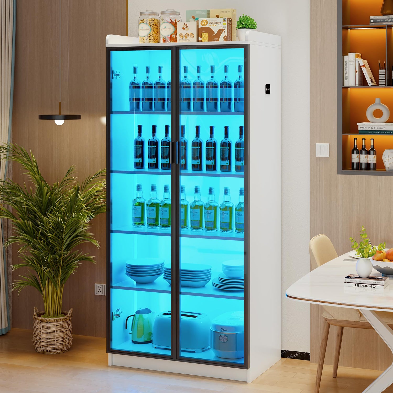 Lvifur 66" Tall Storage Cabinet, LED Kitchen Pantry Cabinet with Human Body Induction, 5 Tier Bookcase Display Cabinet with Adjustable Shelves for Living Room Office (White)