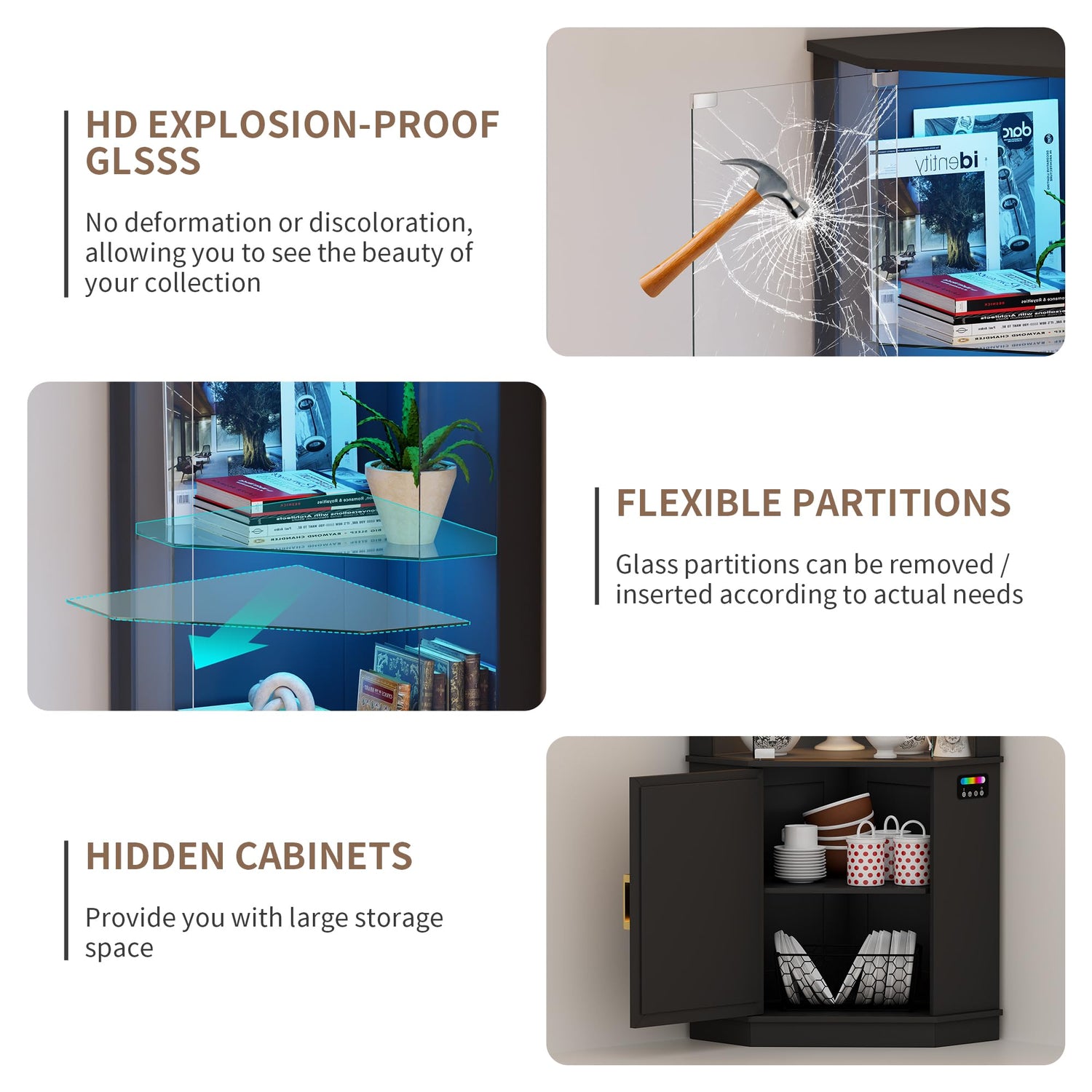 - 【RGB Magic Light】Our glass display cabinet is equipped with 7 static lights and 5 dynamic dancing light modes, adding a modern touch to your living space. At the same time, you can touch the switch to change the color mode, or adjust the brightness by long pressing the touch.