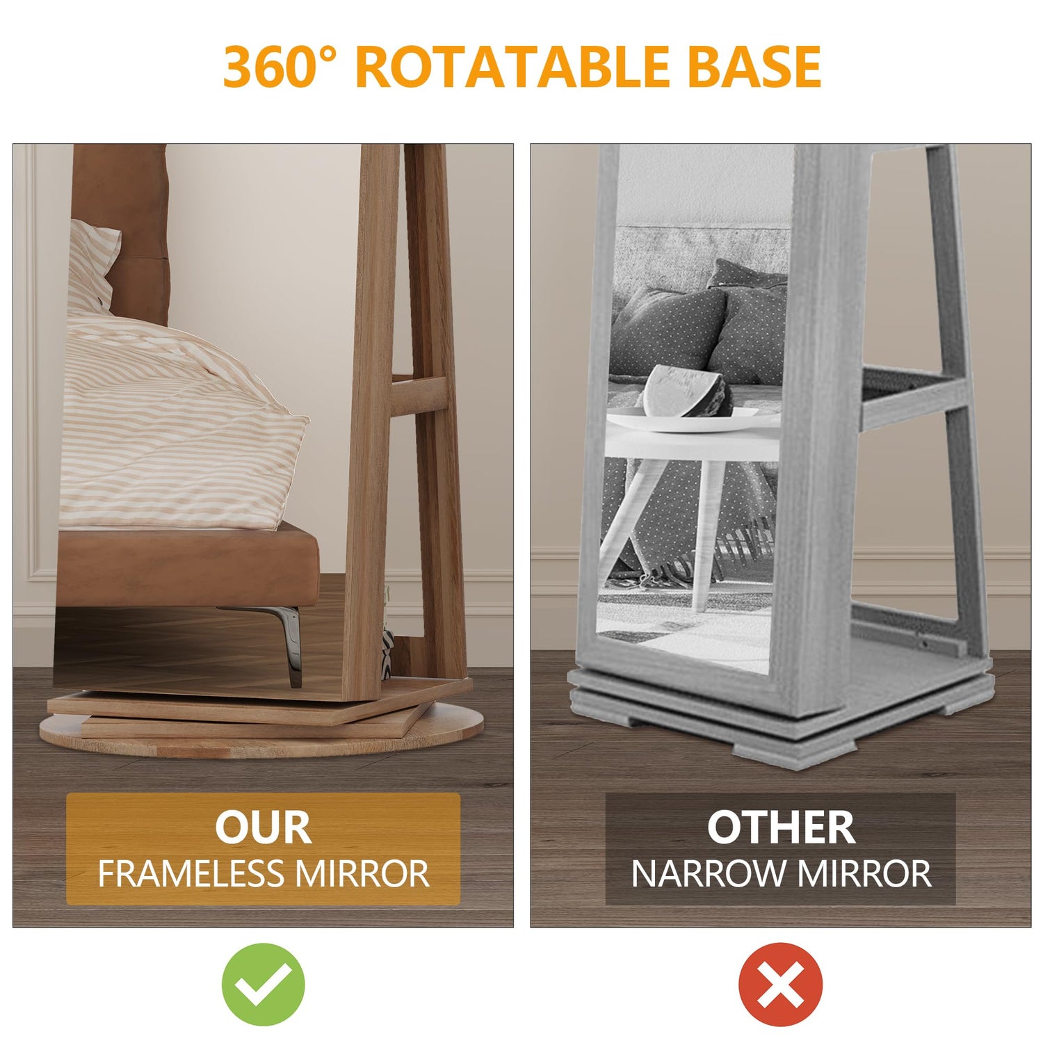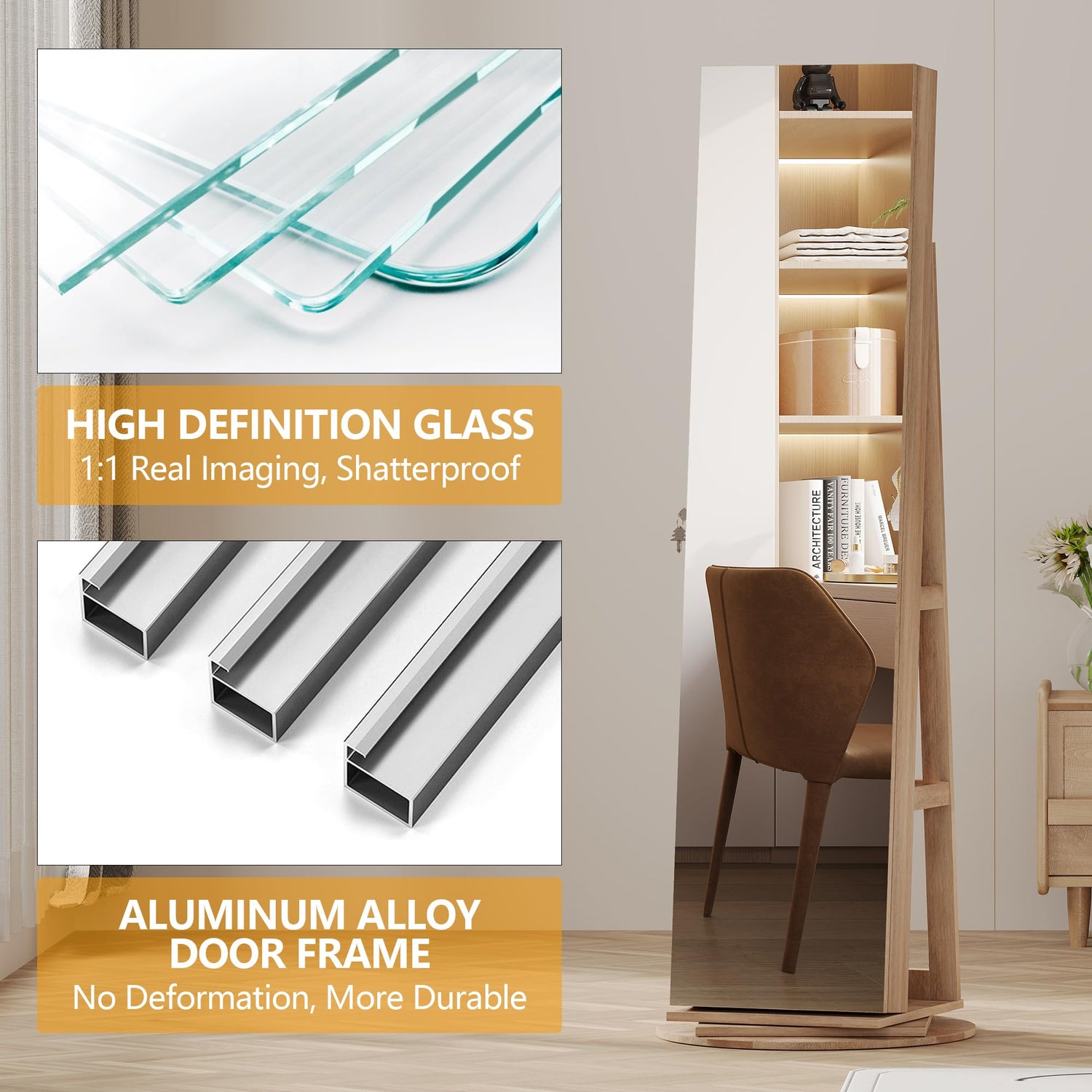 - [360° Swivel Base - Flexible] Rotating jewelry mirror cabinet easy access to the back rack. With a triangular support stand and a 3-tier base, this standing jewelry cabinet organizer ensures a secure and stable structure. Enjoy its versatile functionality and elegant design in any space