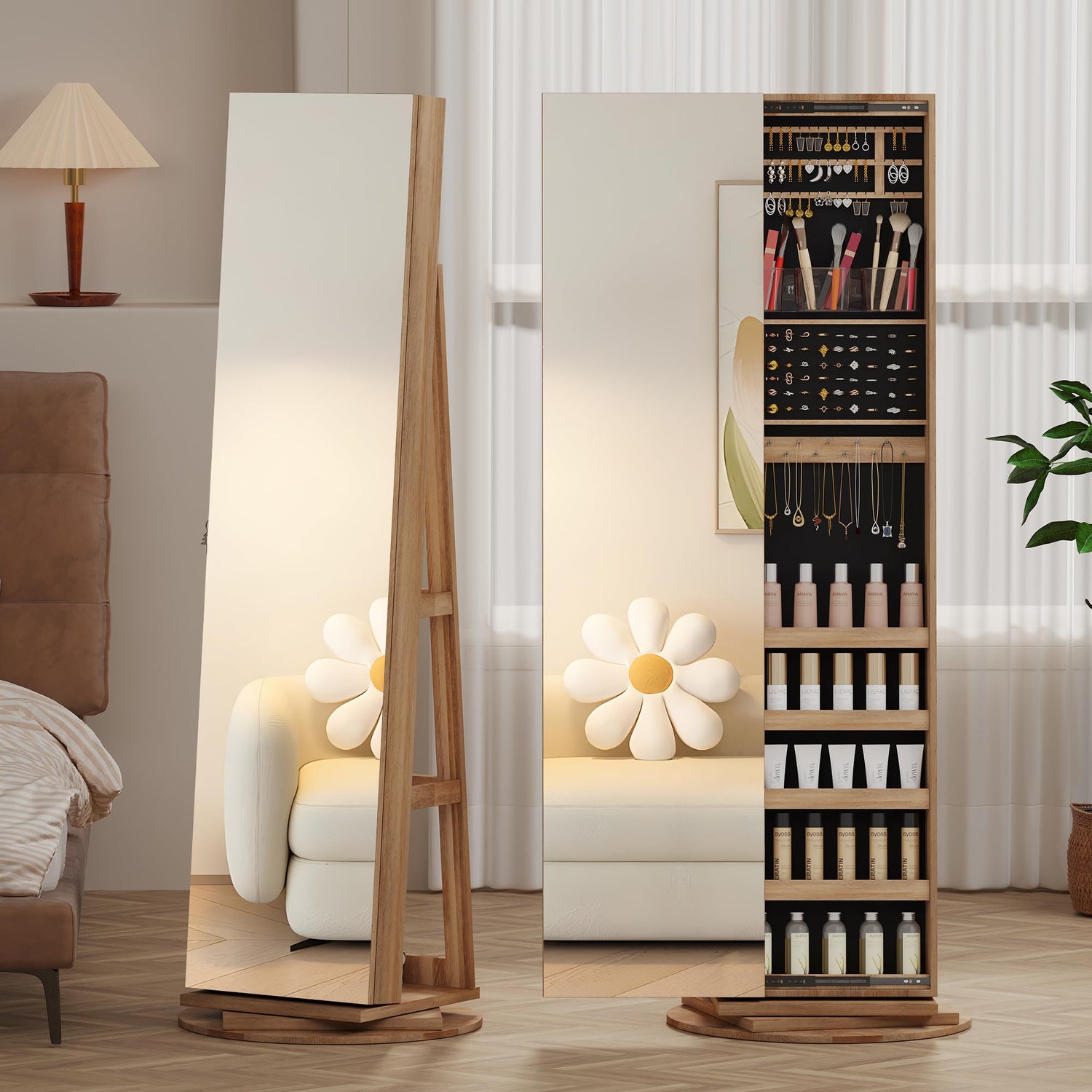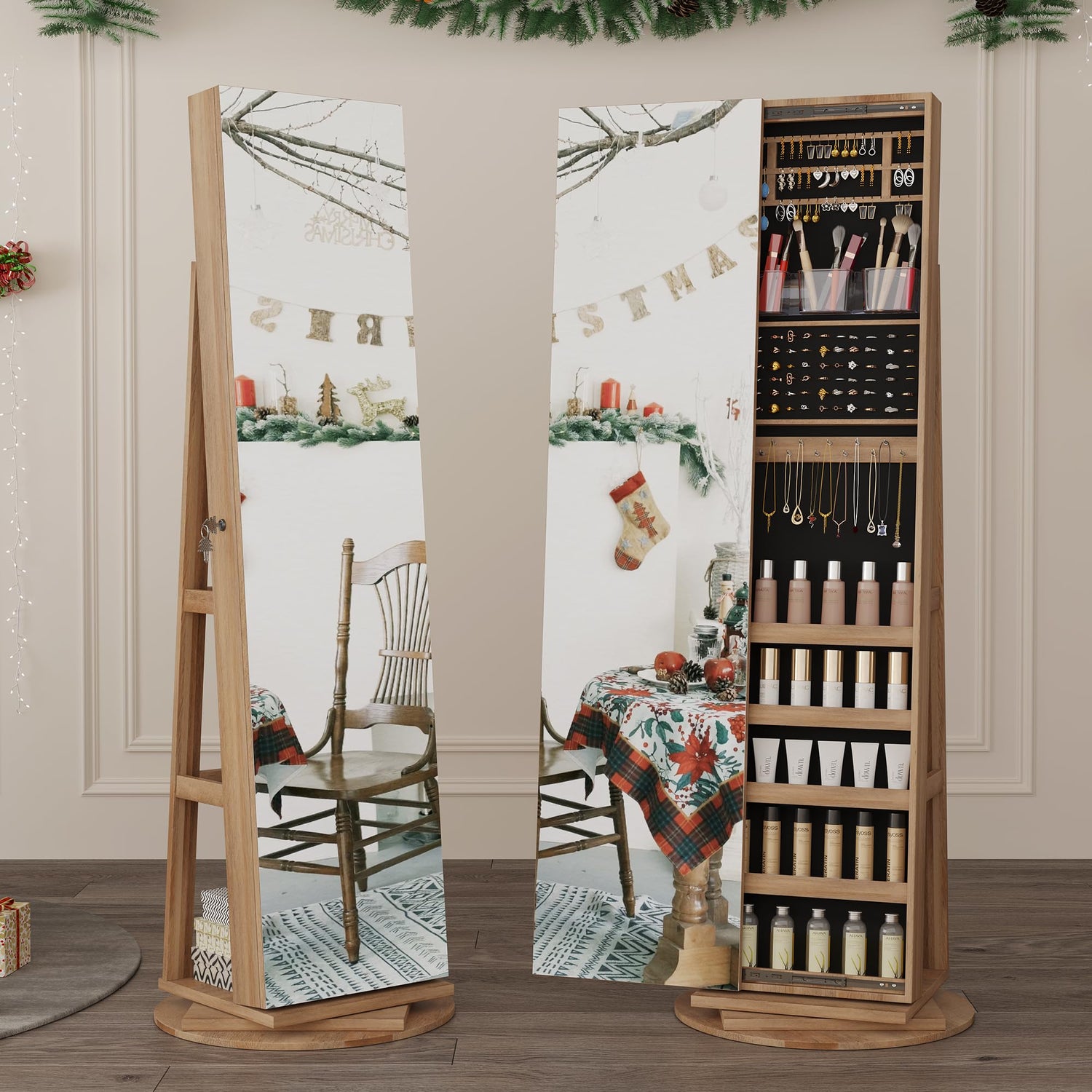 - [3-in-1 Jewelry Armoire - Multifunction] Integrating a jewelry cabinet, and storage shelves behind the full-length mirror. Our jewelry organizer brings a touch of sophistication to any room. Whether it's for birthdays, anniversaries, or special occasions, this gift will be a delightful addition to their daily routine, offering both beauty and utility